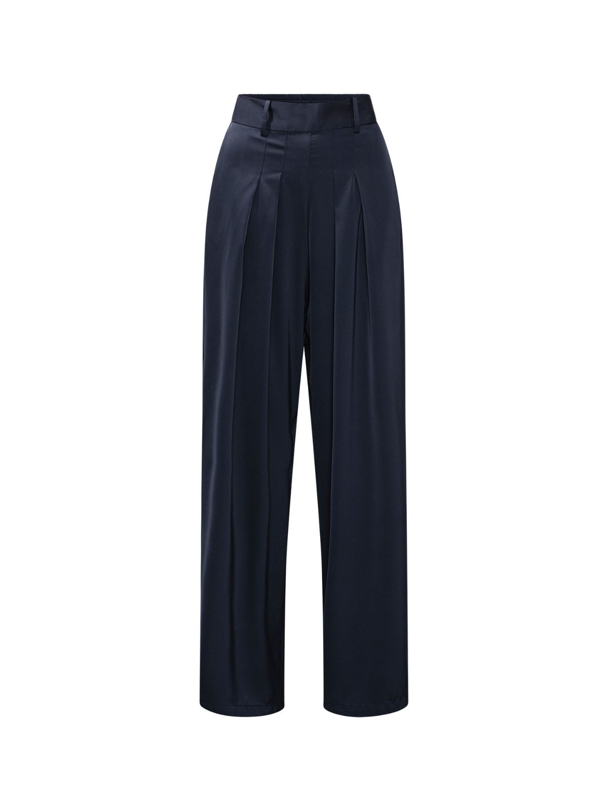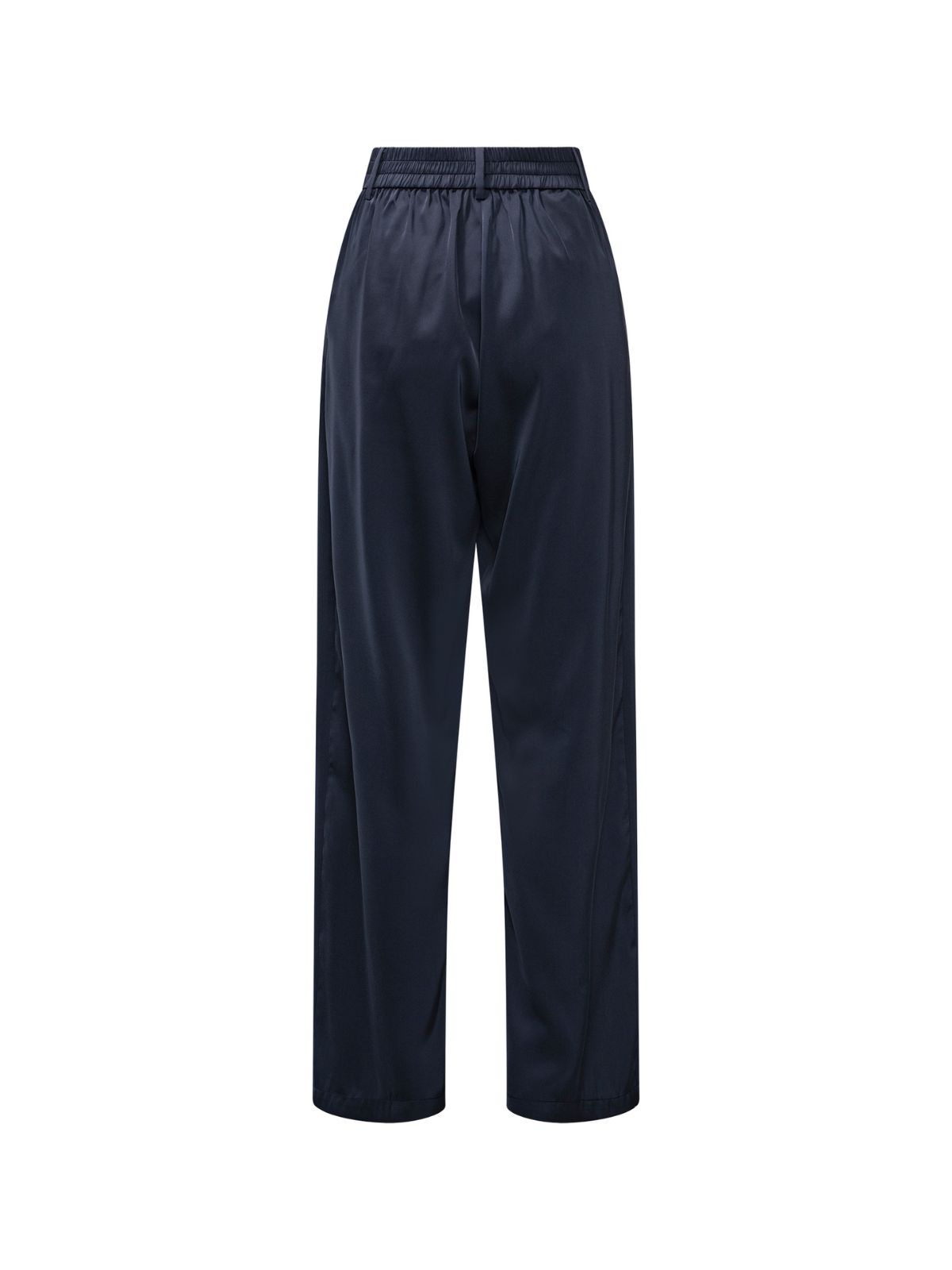 Attraktive højtaljede satin bukser fra KARMAMIA med plisserede detaljer med brede ben, bæltestrop og stiklommer. Buksen har en komfortabel elastisk talje samt loose fit design.Indvendig Benlængde: ca. 82 cm