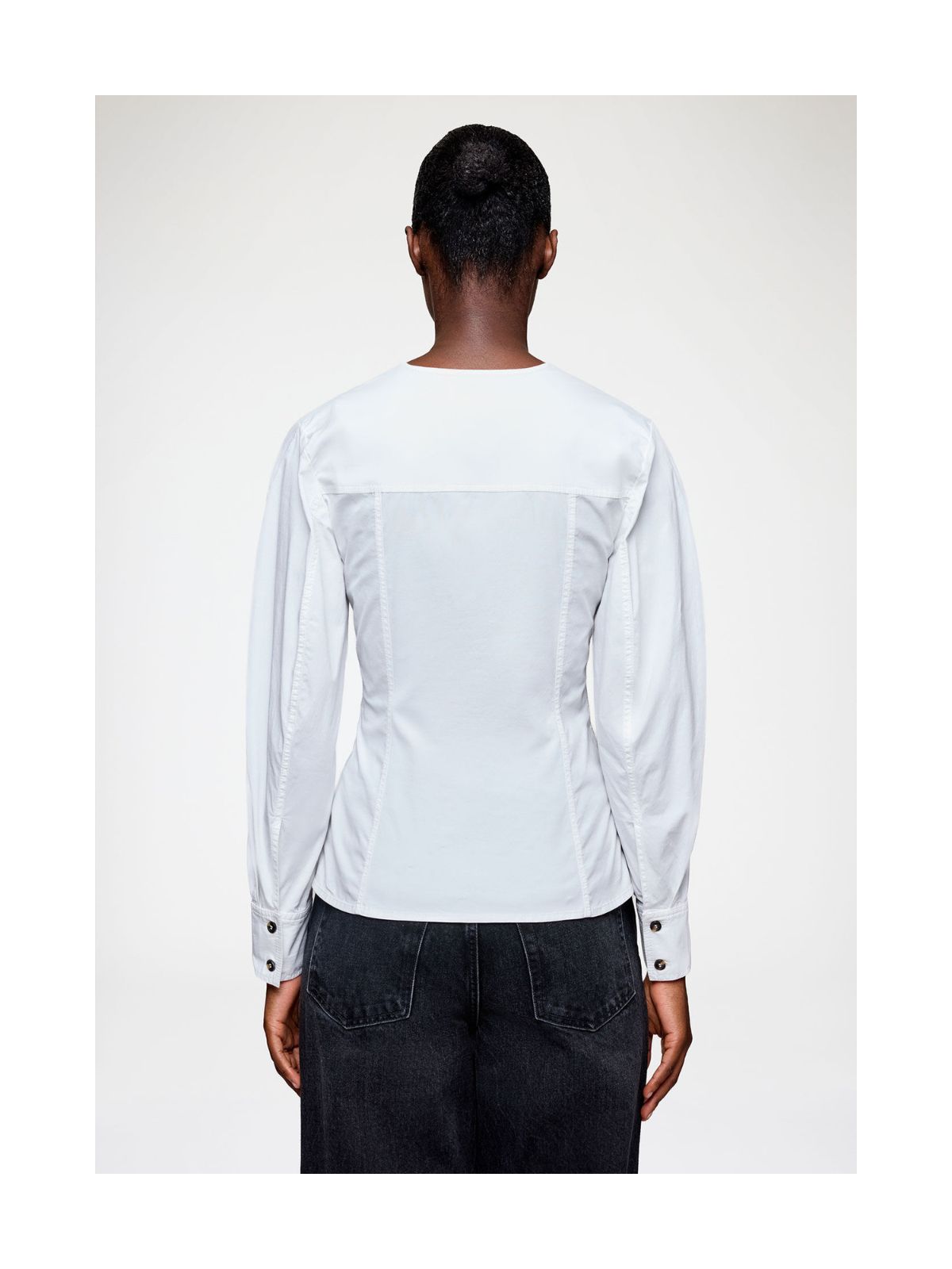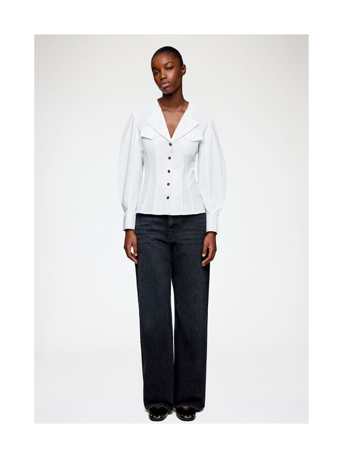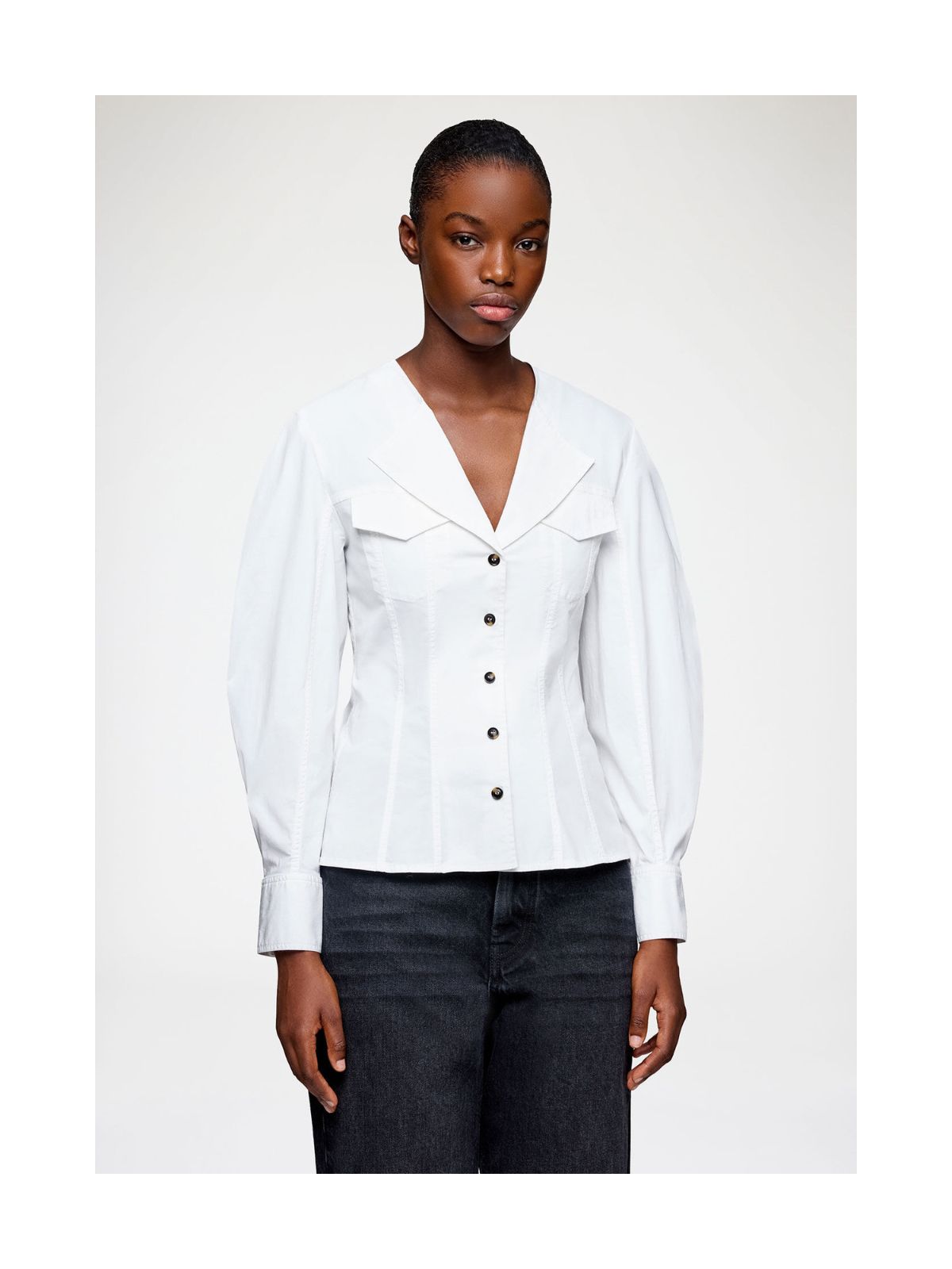 Elegant skjorte bluse fra GANNI med dyb V-hals udskæring med flot revers, taljering, knaplukning foran og brystlommer samt lange ærmer med bred manchet.Længde: ca. 60 cm