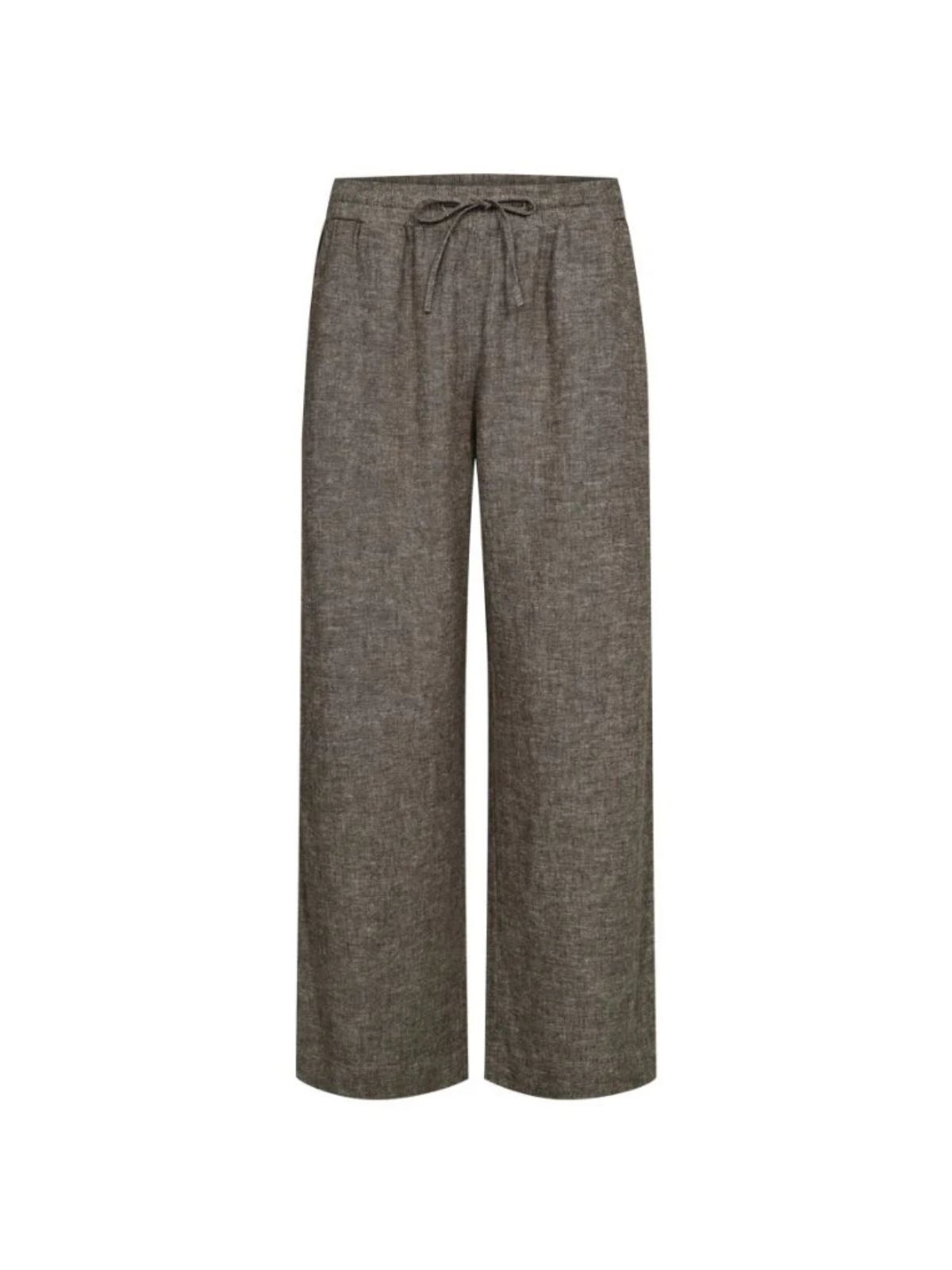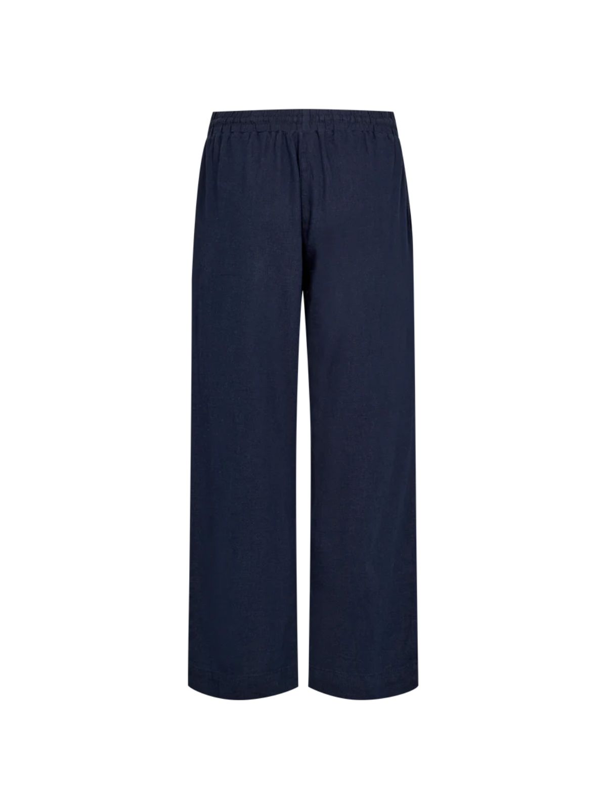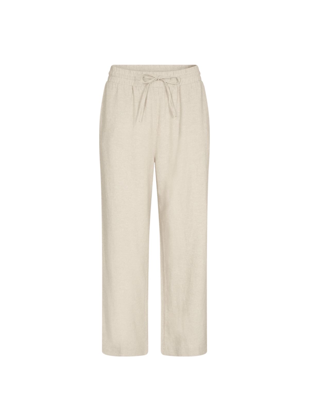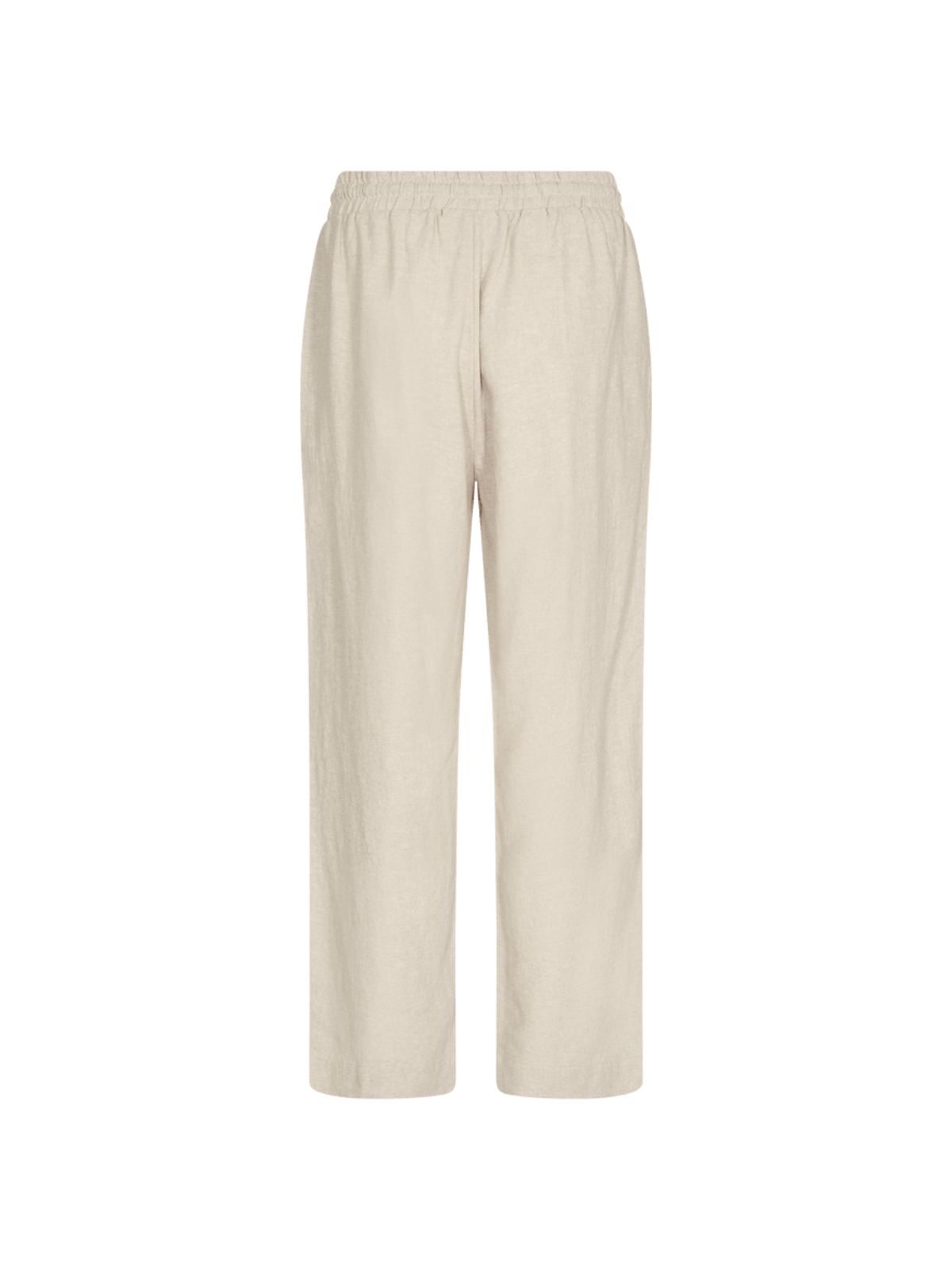 Ankellange hørbukser fra Freequent i en let hørkvalitet. Bukserne er enkle i modellen med elastik og bindebånd i den høje talje, sidelommer samt en skøn flatterende løs pasform.Indvendig Benlængde: 70 cm