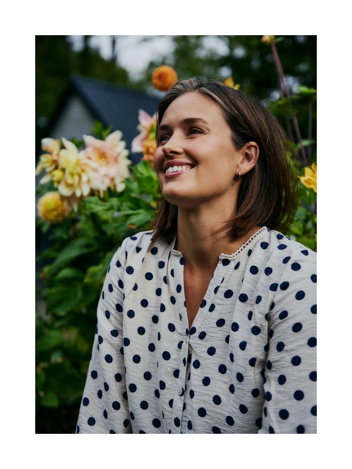 Charmerende bluse fra Freequent i en blød struktur kvalitet med allover prikker. Blusen er enkel i modellen med V-udskæring, trekvartærmer, knaplukning samt læg på ryggen for ekstra komfort.Længde: ca. 66 cm