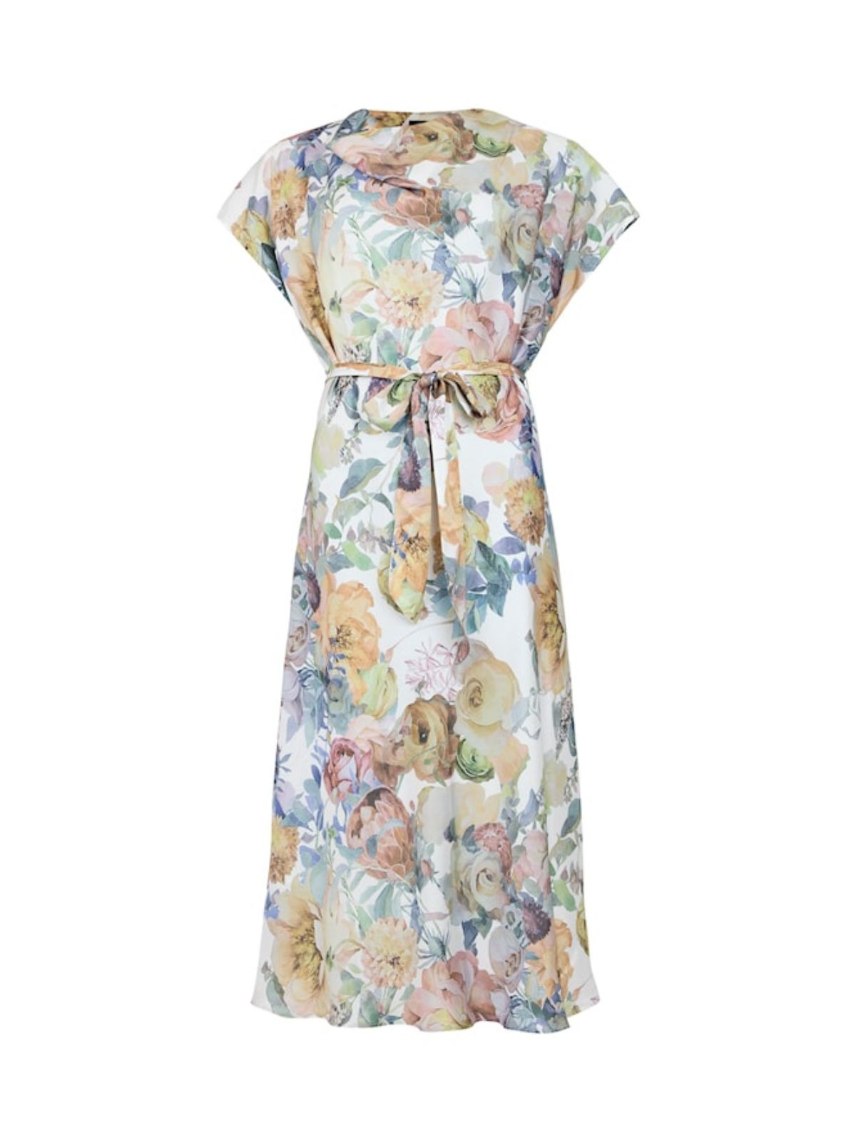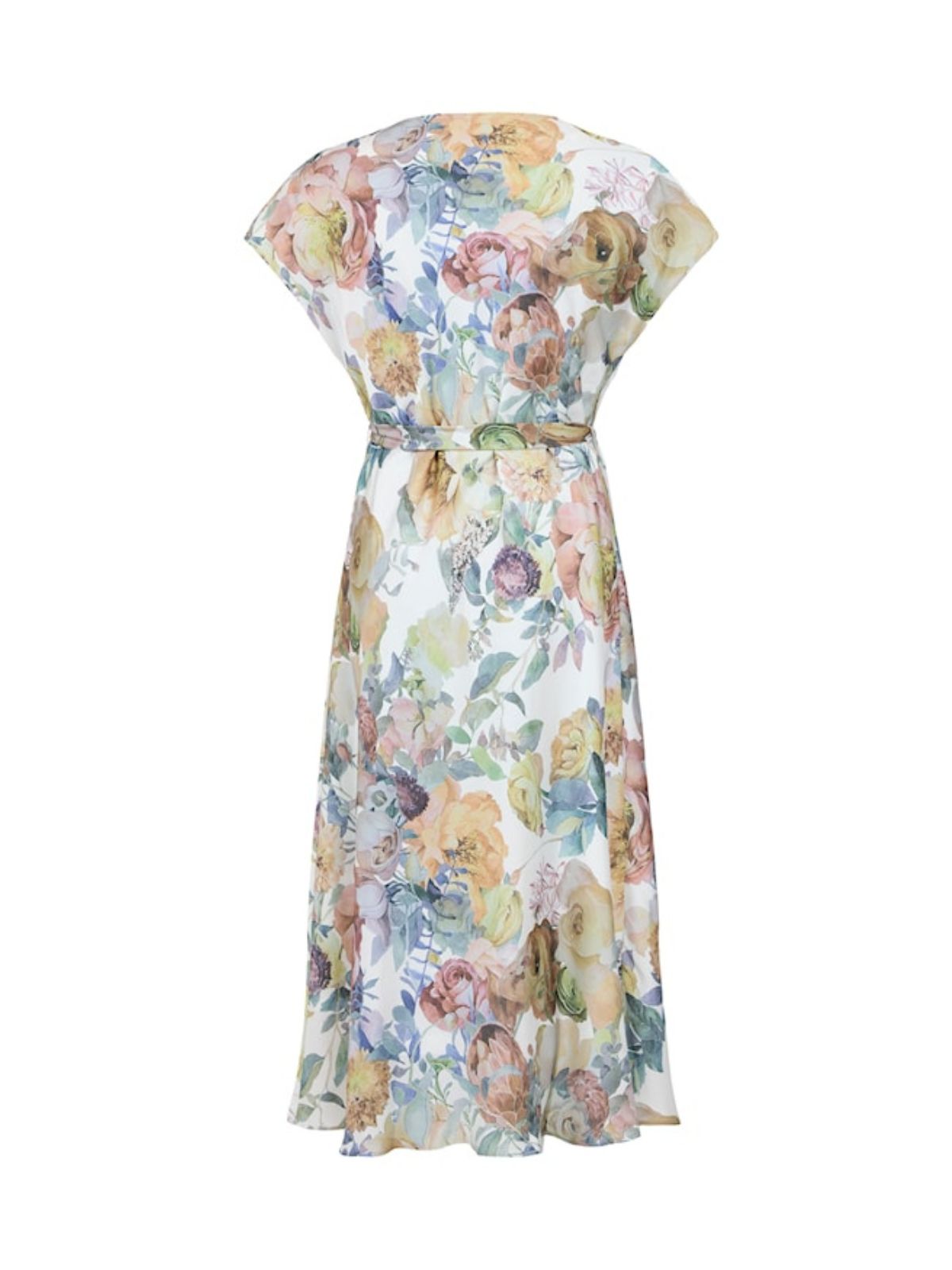 Stilfuld flora kjole fra MOLLY JO i stilfuldt floralt mønster.Kjolen har en fashionabel vindfals krave, let taljeret snit med løst bindebælte samt korte ærmer. Kjolen er i en komfortabel kvalitet der forener elegance og stil. En kjole til mange anledninger!Længde: 130 cm MIDI
