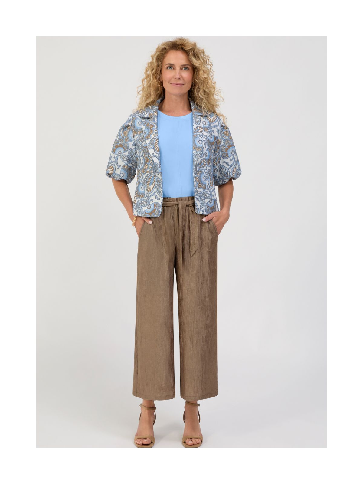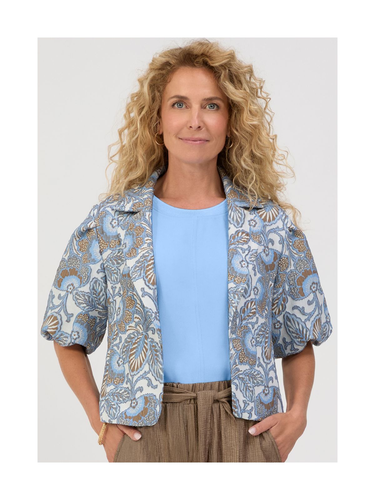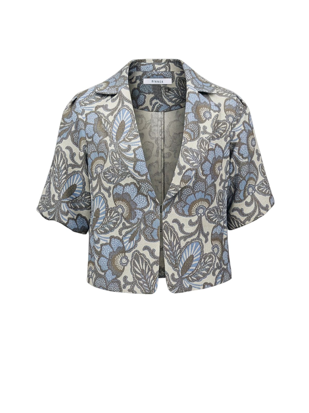 Raffineret kort sommer blazer jakke fra BIANCA med elegant mønster. Jakken har krave samt revers og hægte lukning foran samt korte ærmer.Længde: ca. 58 cm