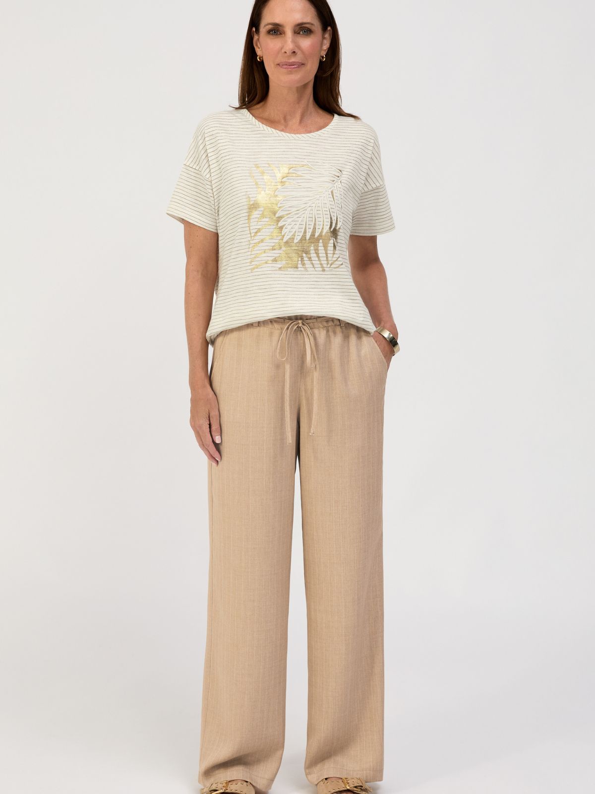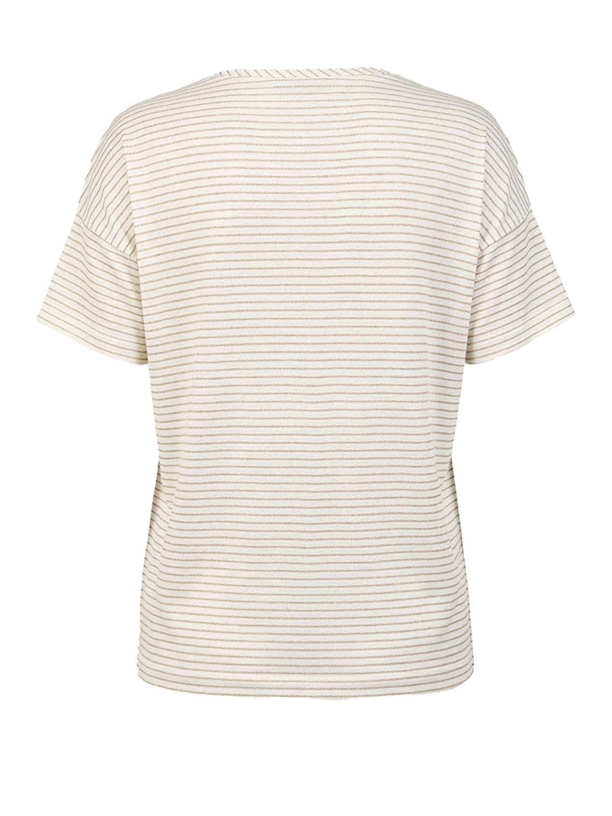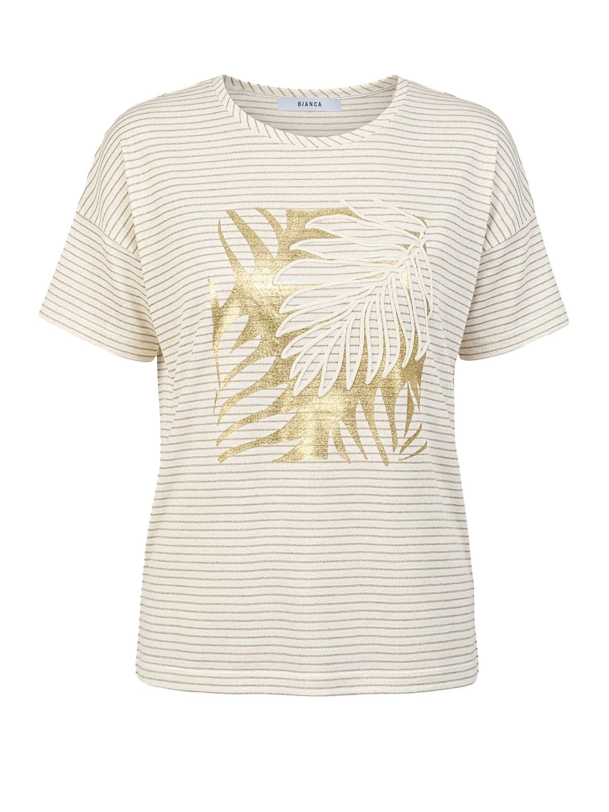 Stilfuldt Julie bluse fra BIANCA med sit fine stribede mønster, et moderigtigt motiv foran med guldfolie og en klassisk rund halsudskæring. Droppede skuldre, korte ærmer og en ribkant fuldender det smarte look. Takket være dens højkvalitets bomuldsblanding med elastan og afslappede pasform er Julie usædvanligt behagelig at have på – en alsidig ledsager til mange lejligheder.Længde: ca. 62 cm