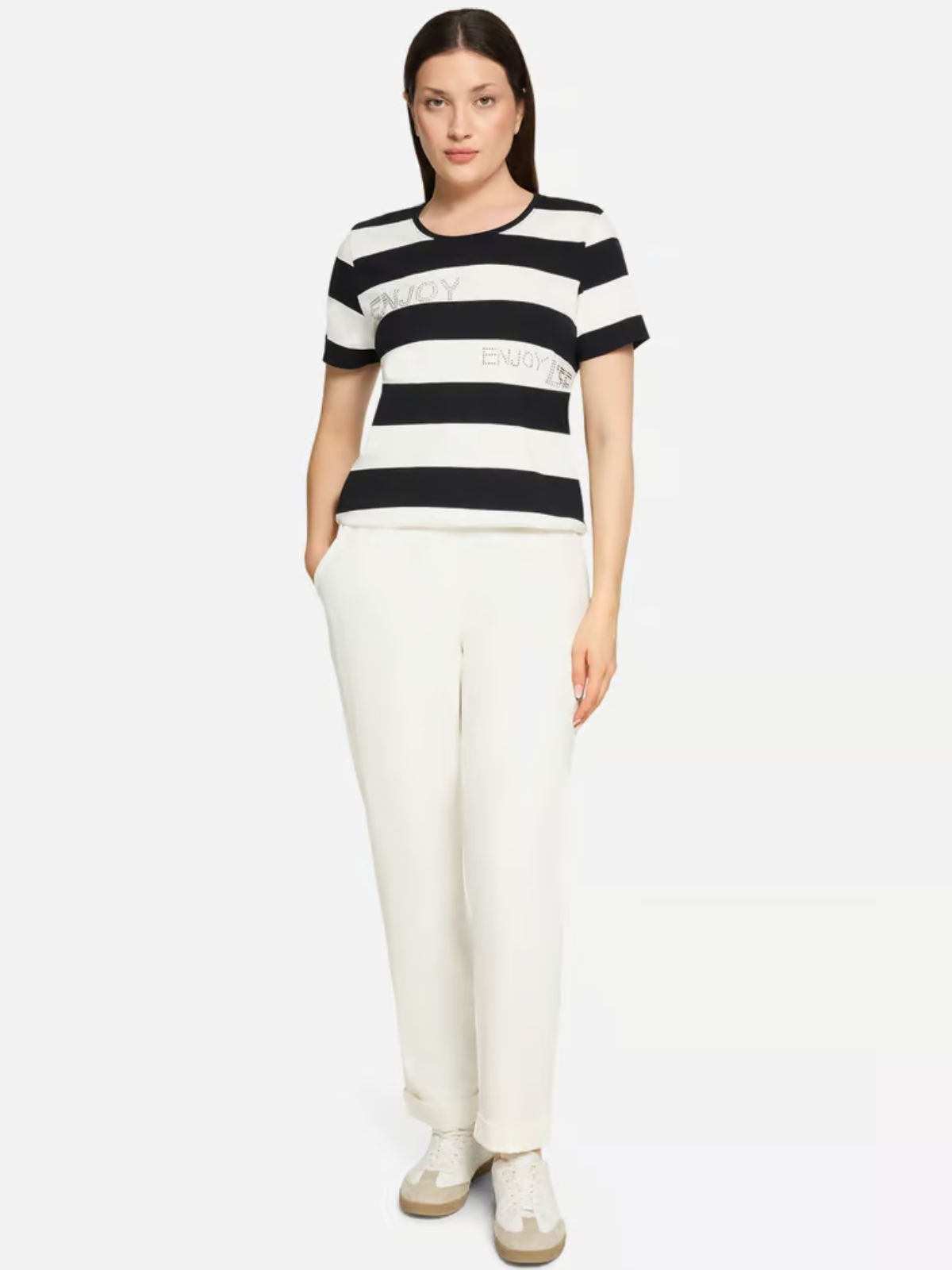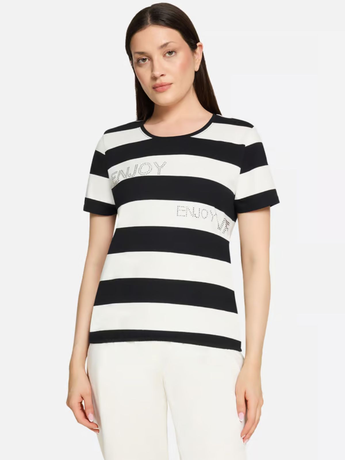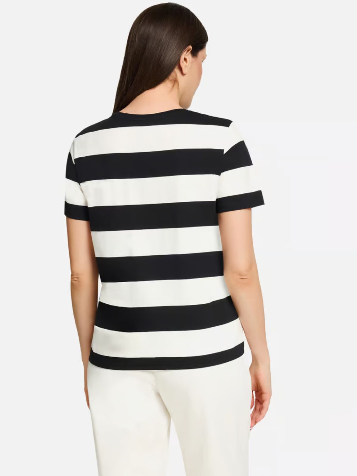 Sporty stribet bluse fra Betty Barclay SO COSY er perfekt til et afslappet og casual look. Blusen har sænkede skuldre og en klassisk rund halsudskæring samt iøjnefaldende træk med de glitrende rhinsten, der tilføjer et strejf af glimmer til det stribede mønster. Det tætsiddende snit sikrer en flatterende silhuet, mens snørebåndet forneden tilføjer et trendy touch.Længde: ca. 60 cm