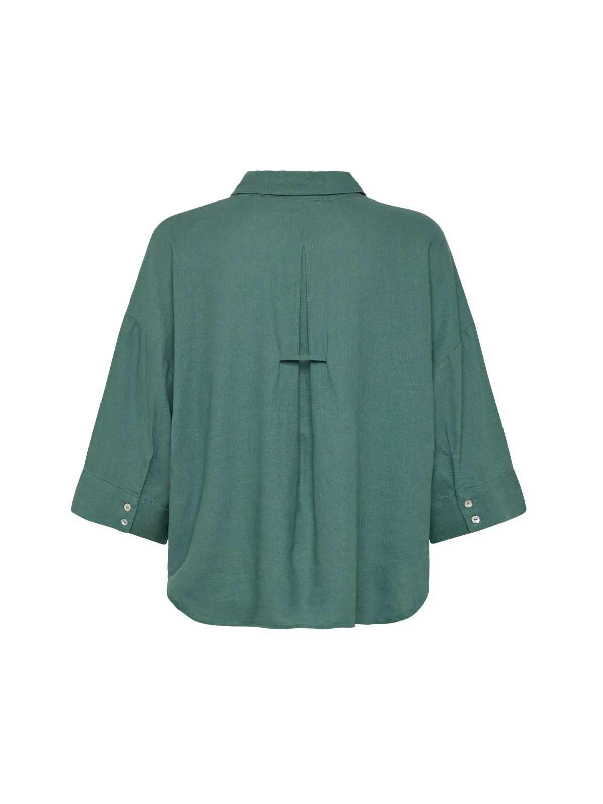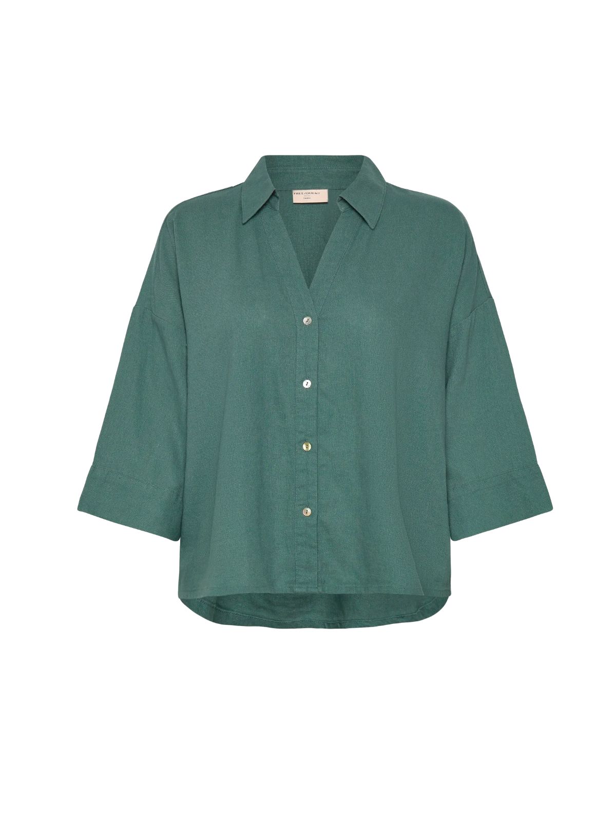 Smart hør skjorte fra Freequent i flatterende design med god volume. Skjorten har krave, V-udsnit, drop skuldre, 3/4 lange ærmer og knaplukning. I ryggen har skjorten ekstra læg og vide.Længde: ca. 65 cm