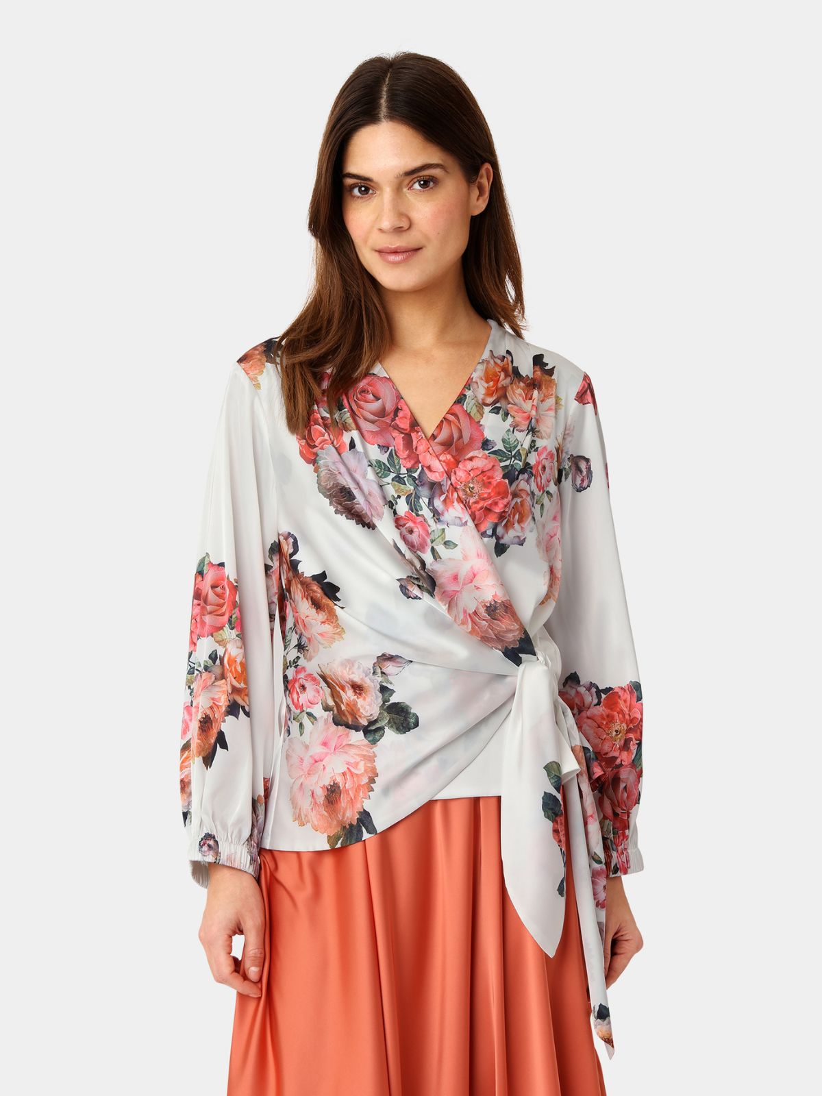 Fortryllende slå-om-bluse fra KARMAMIA i elegant flora print samt i tidløst design. Blusen har en dyb udskæring samt bindebånd i siden og lange ærmer med elastisk kant.Længde:.ca. 58 cm