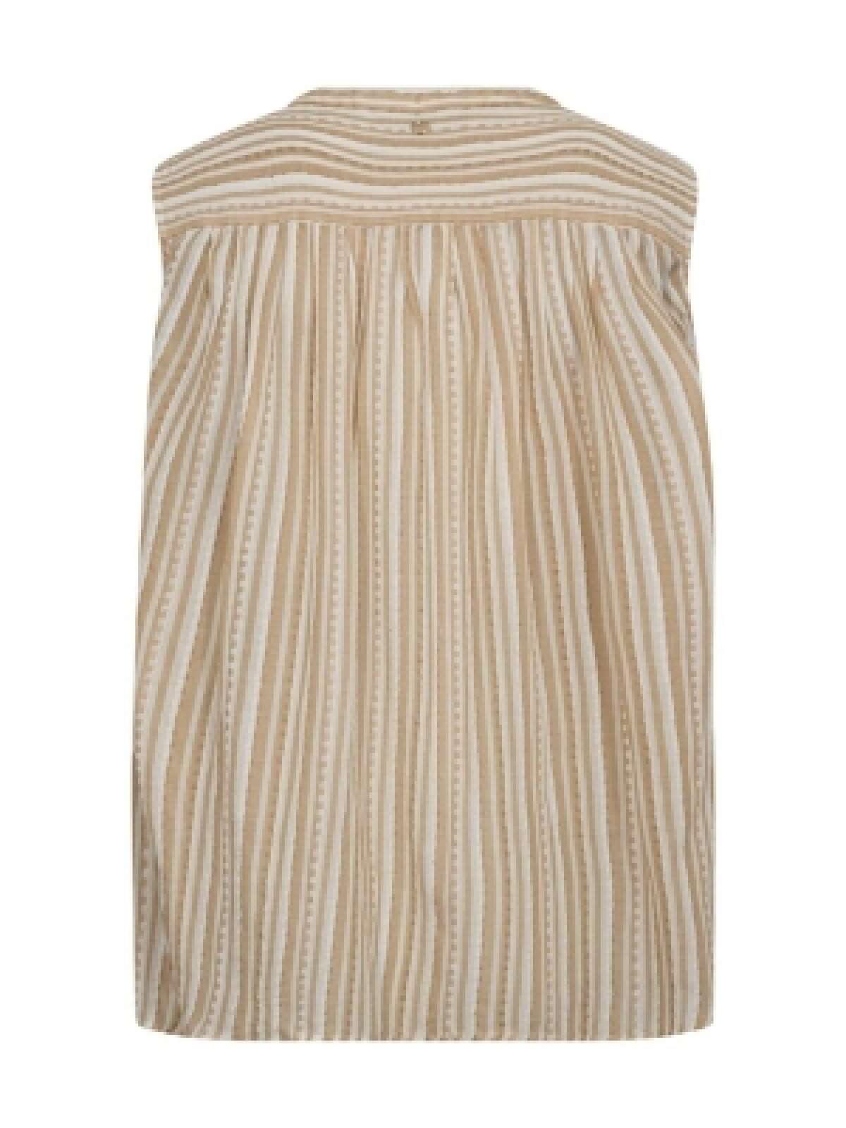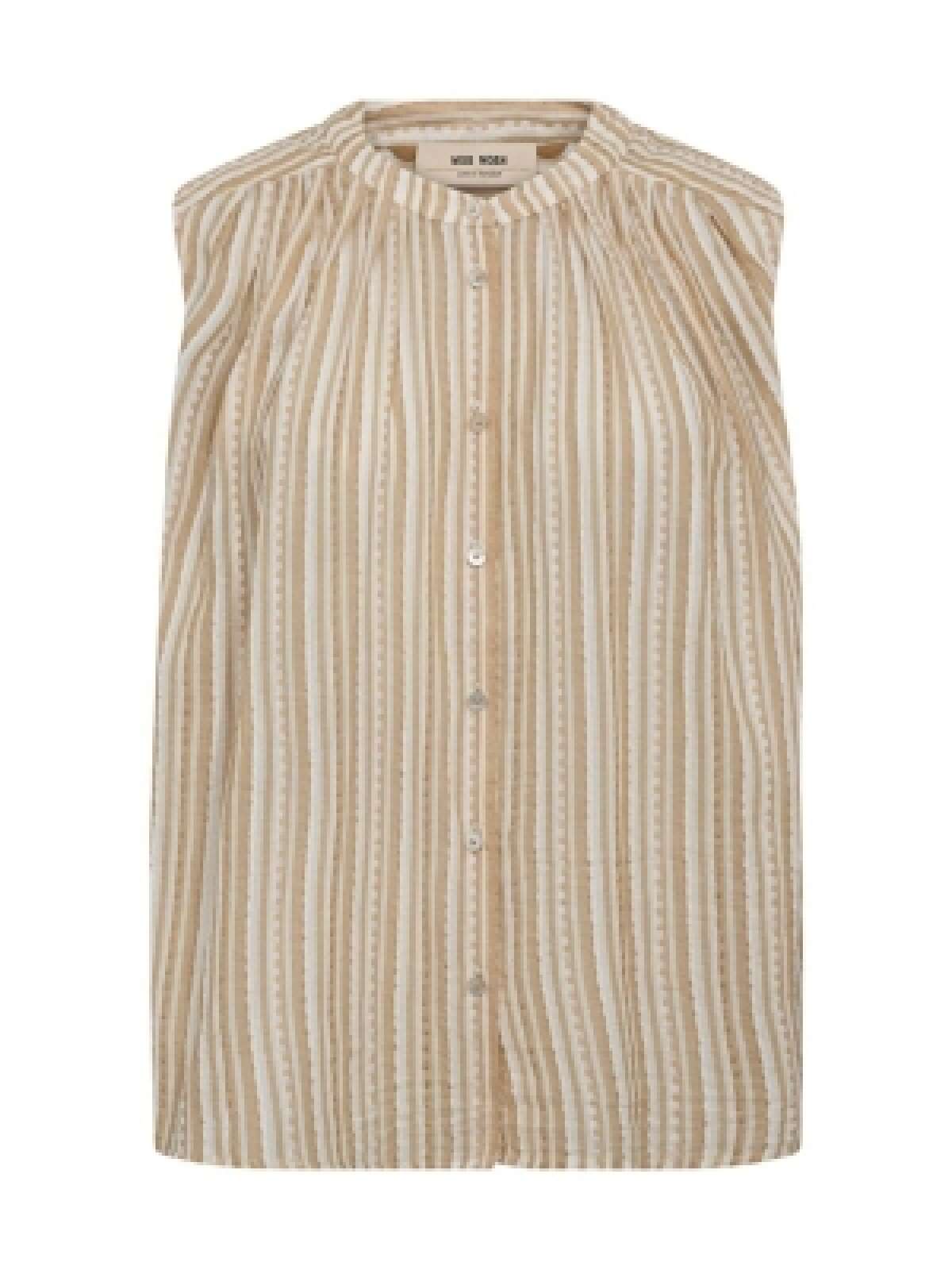 Denne søde top fra Mos Mosh er fremstillet i let og lækker økologisk bomuld, der giver et naturligt og behageligt fald. Det fine stribede design med indvævet mønster tilfører et subtilt og elegant udtryk, mens kinakraven og den gennemknappede front med lyse knapper giver et klassisk touch.Små læg ved skuldrene skaber ekstra bevægelse i materialet, og den let længere bagkant giver en flatterende silhuet. Toppen har en løs pasform, som gør den både komfortabel og nem at style til hverdag.