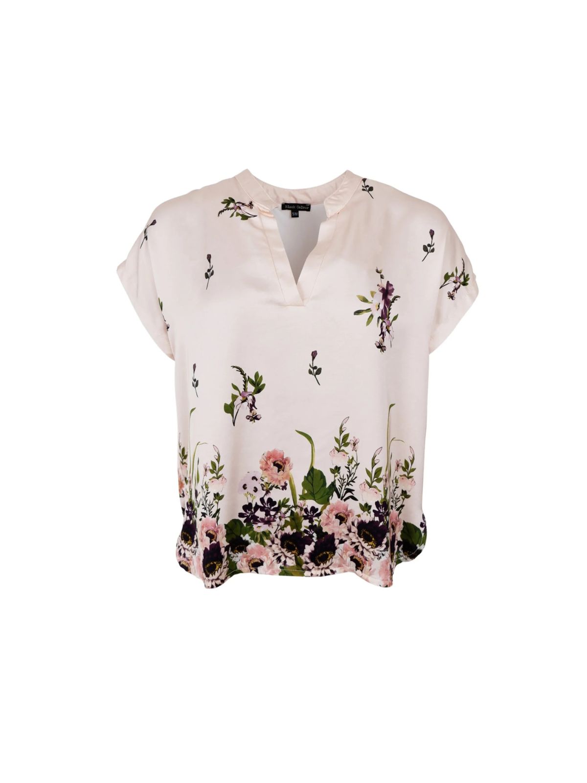 Elegant feminin flora bluse fra BLACK COLOUR i en blød og behagelig viskosekvalitet, der falder flot og giver et elegant udtryk. Designet med en afslappet pasform og korte, løse ærmer, som skaber et ubesværet og stilrent look.Den åbne V-udskæring tilfører et feminint touch, mens det farverige blomsterprint giver toppen liv og personlighed