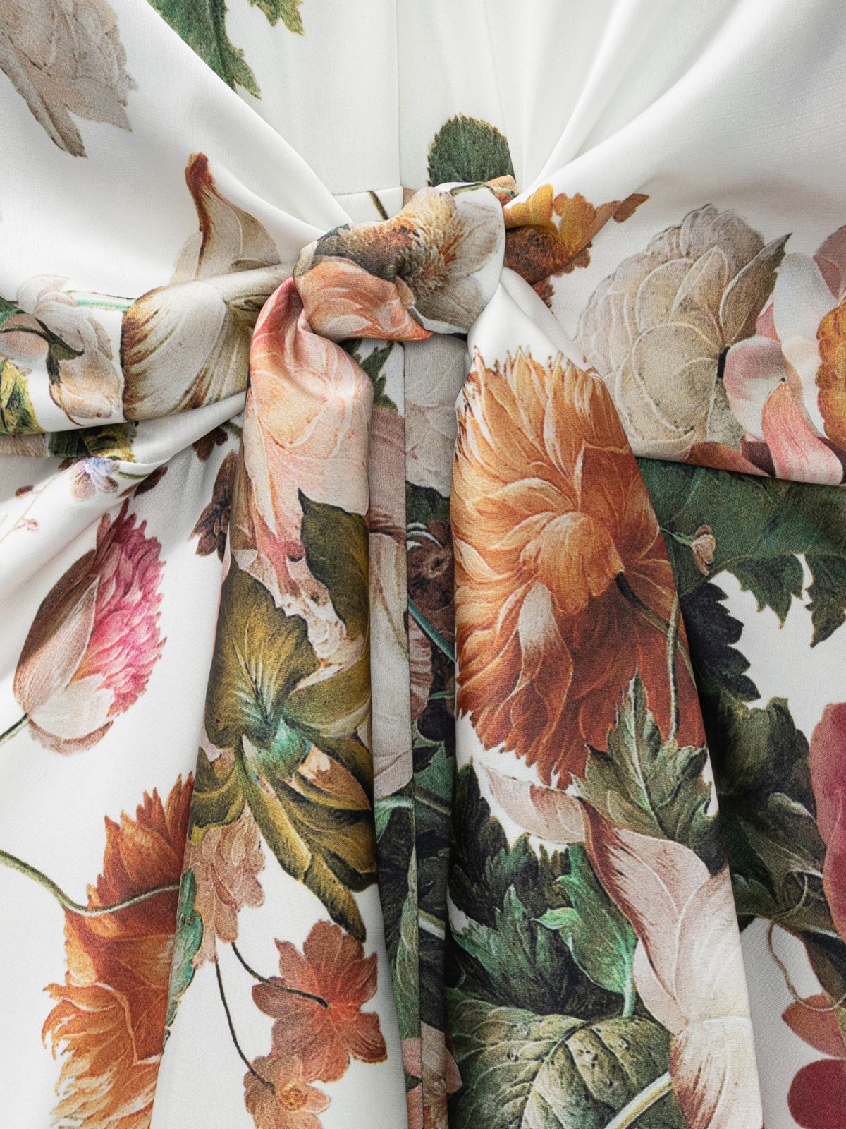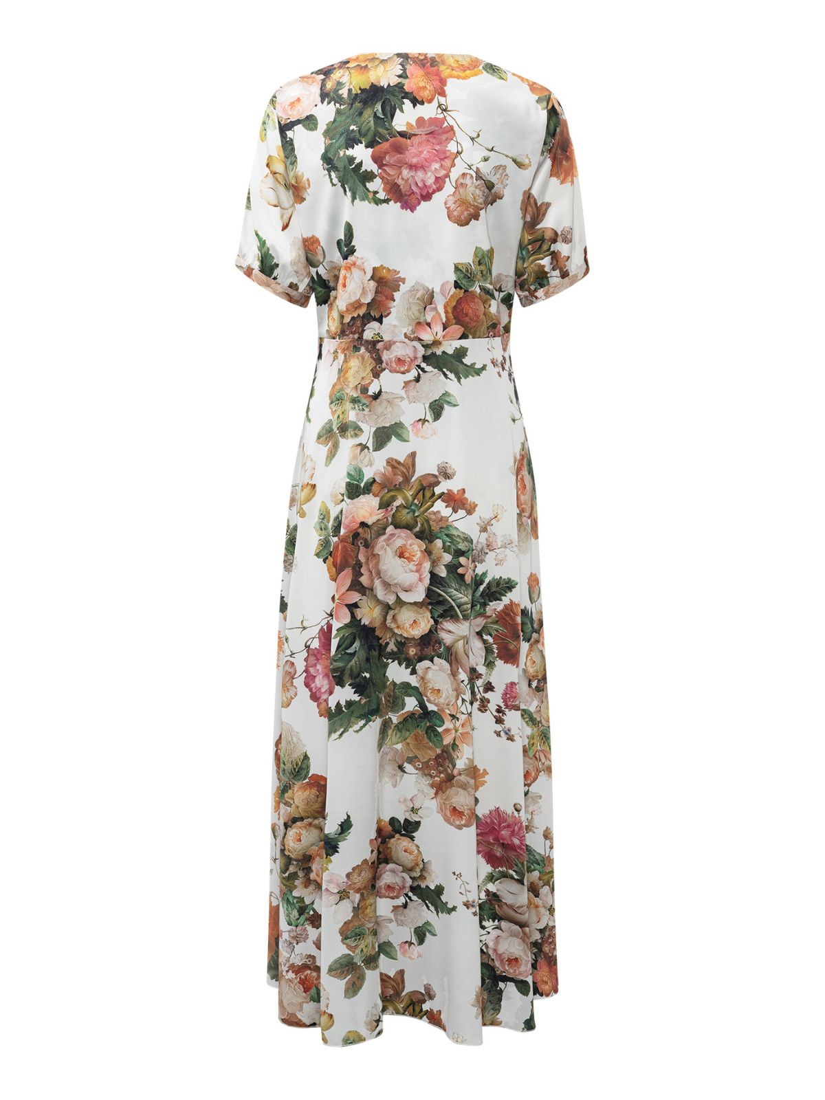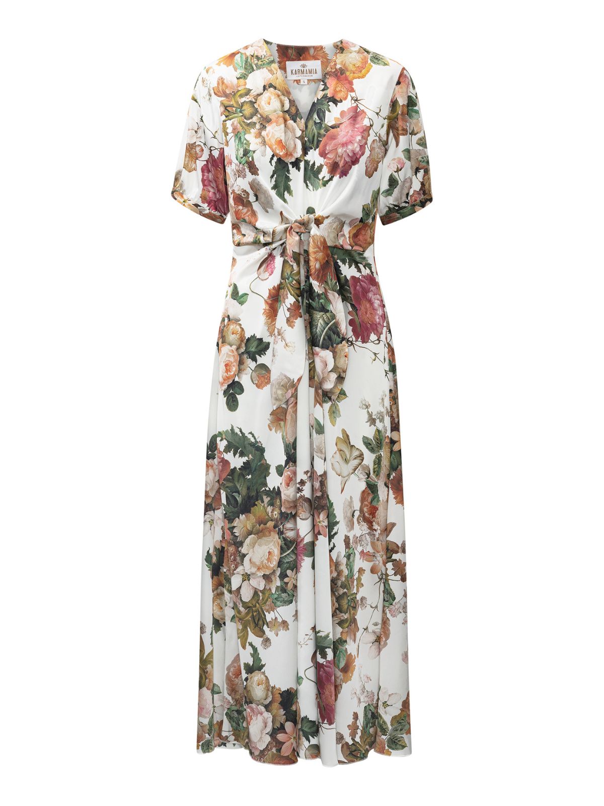 Imponerende smuk maxi kjole fra Karmamia i farevrigt blomster mønster. Kjolen har en rund hals med dyb V-udsnit samt flot taljering med knude effekt foran samt korte ærmer.Længde: MAXI