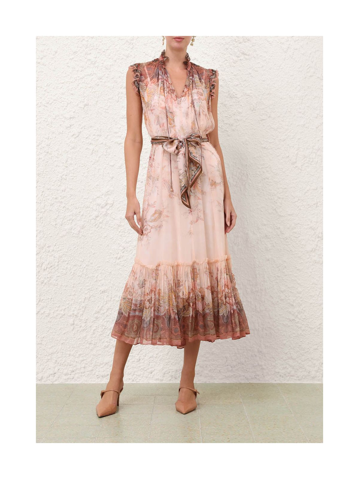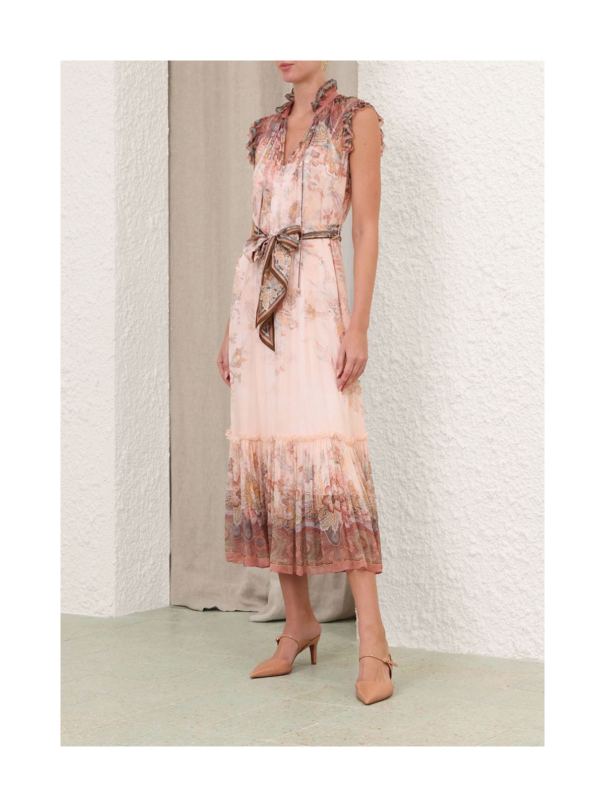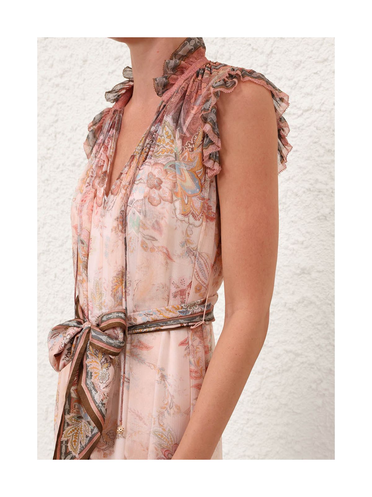 Stilfuld Alchemy Flutter-kjole fra ZIMMERMANN i pink paisley mønster fra serien Kindred Spirit. Kjolen er en midikjole med dyb V-udskæring med rouleau-bånd, aftageligt tørklædebælte. Kjolen har rund hals med draperinger, bindebånd samt dekorativ flæse ligeså på ærmekanten og forneden på kjolen. Der medfølger underkjole.Str. 1 / 38 - 2/ 40 - 3 / 42