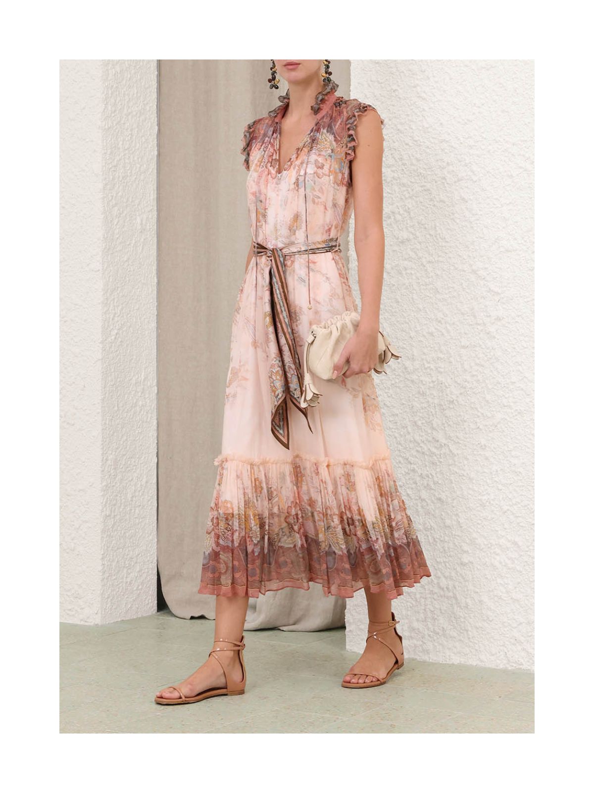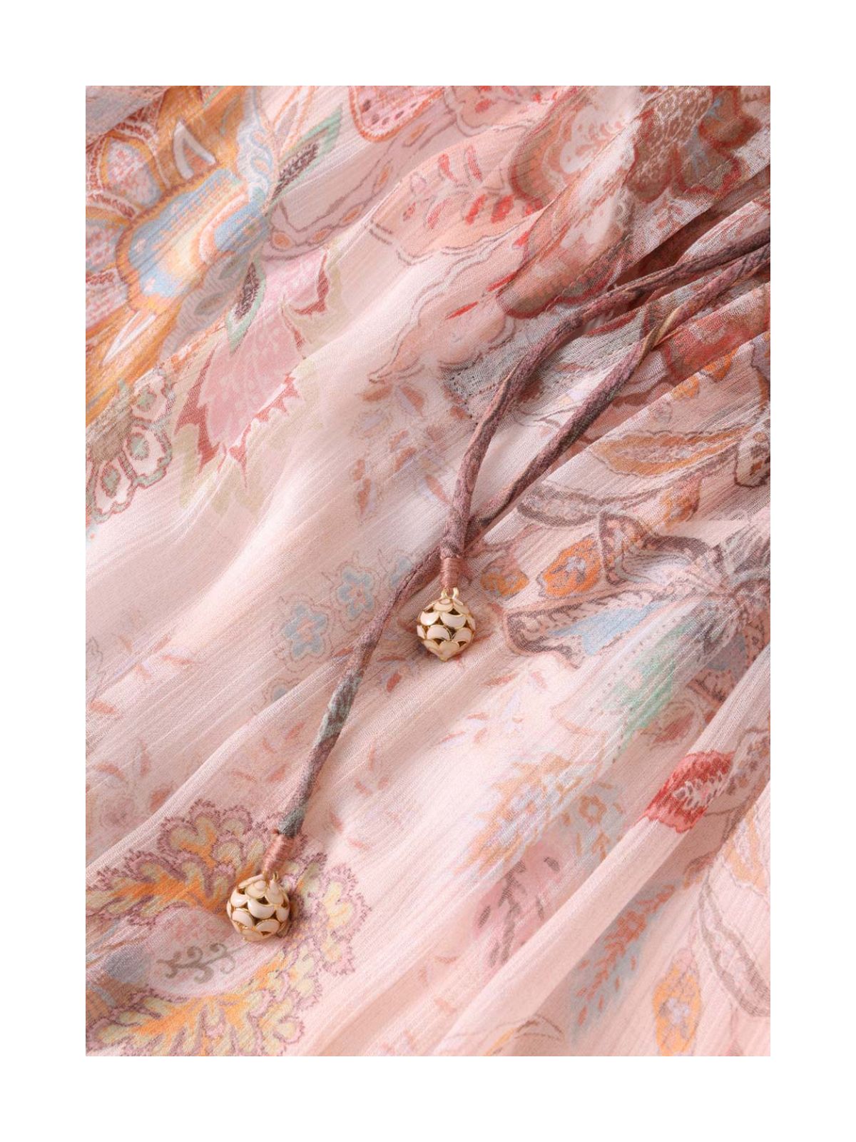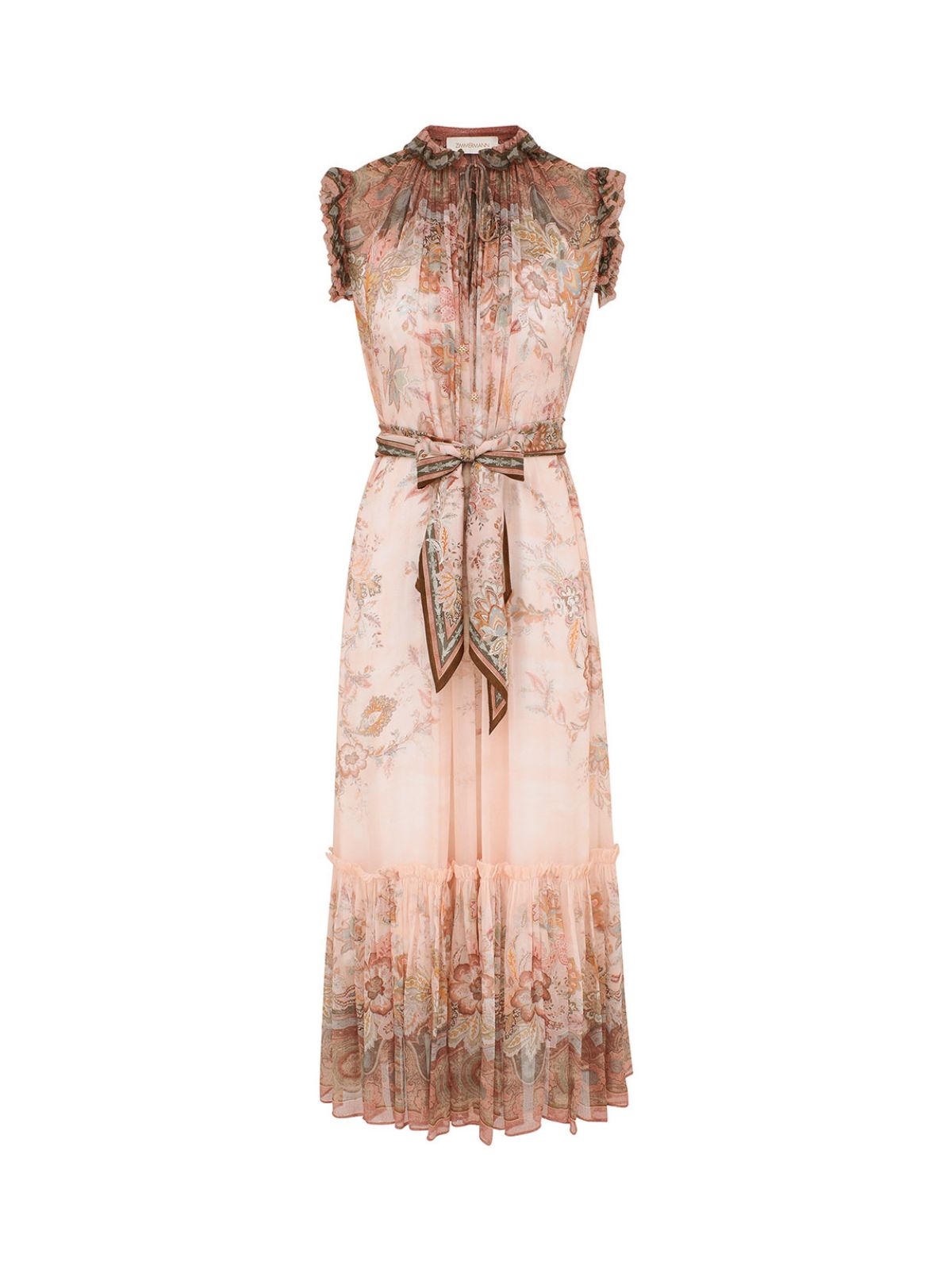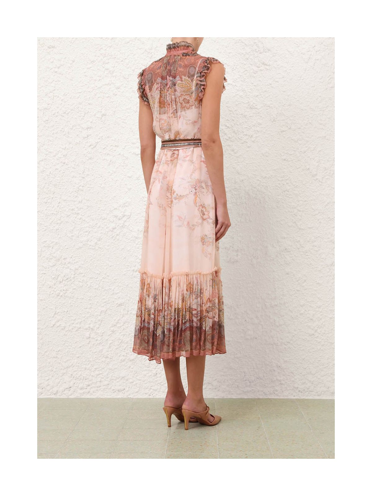 Stilfuld Alchemy Flutter-kjole fra ZIMMERMANN i pink paisley mønster fra serien Kindred Spirit. Kjolen er en midikjole med dyb V-udskæring med rouleau-bånd, aftageligt tørklædebælte. Kjolen har rund hals med draperinger, bindebånd samt dekorativ flæse ligeså på ærmekanten og forneden på kjolen. Der medfølger underkjole.Str. 1 / 38 - 2/ 40 - 3 / 42