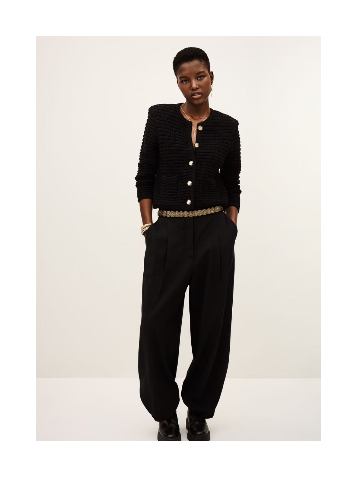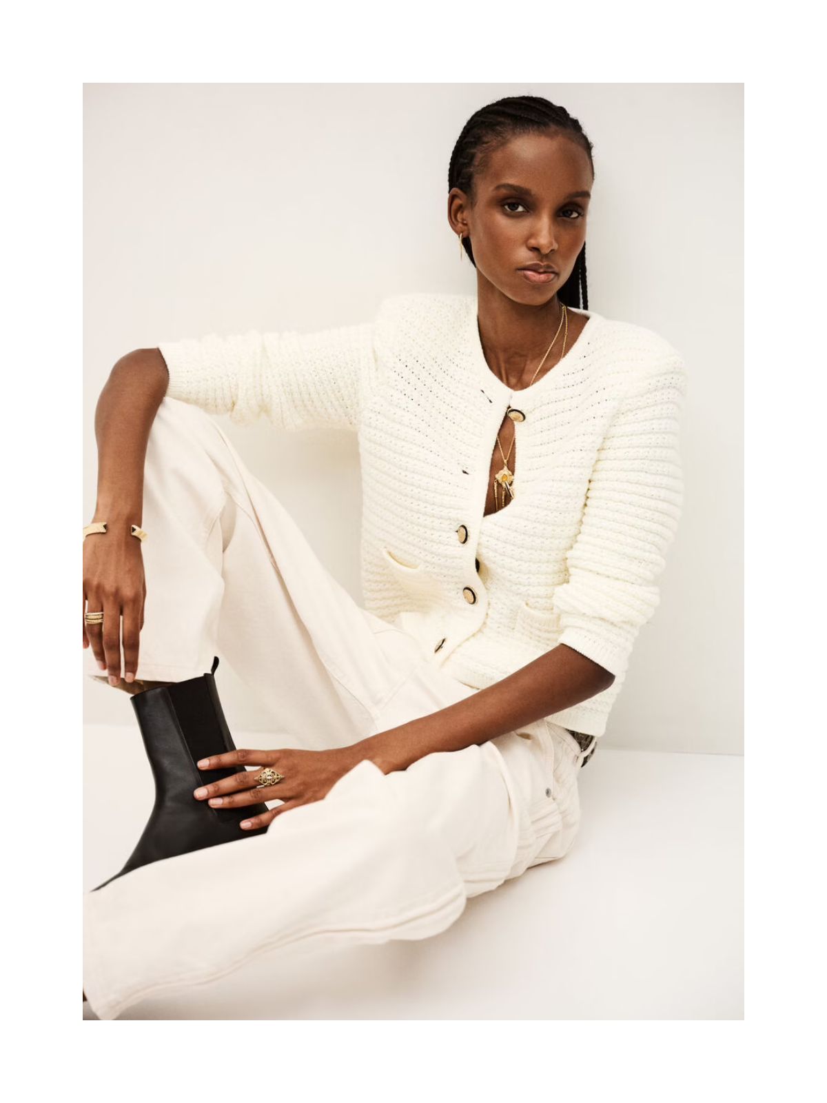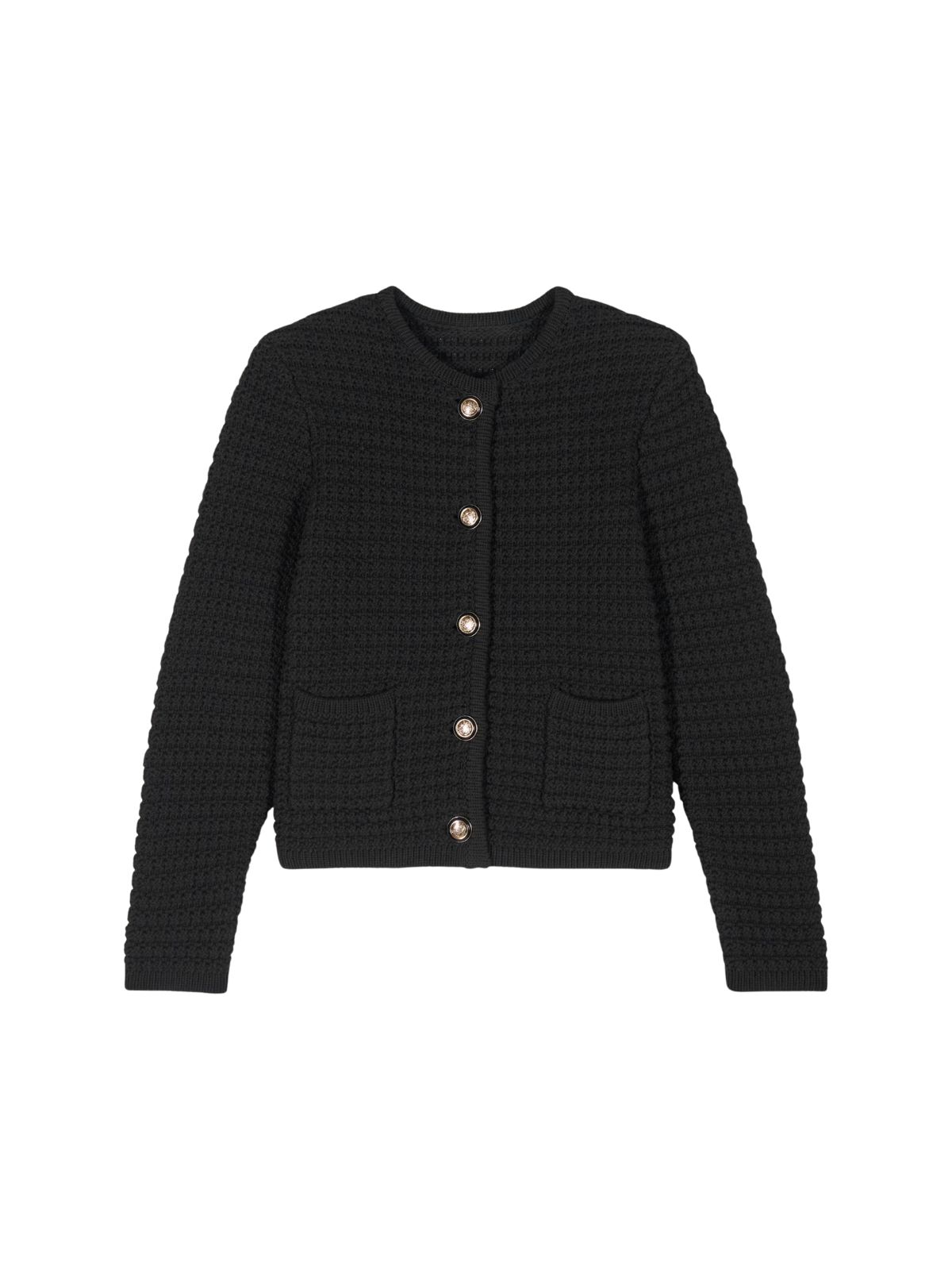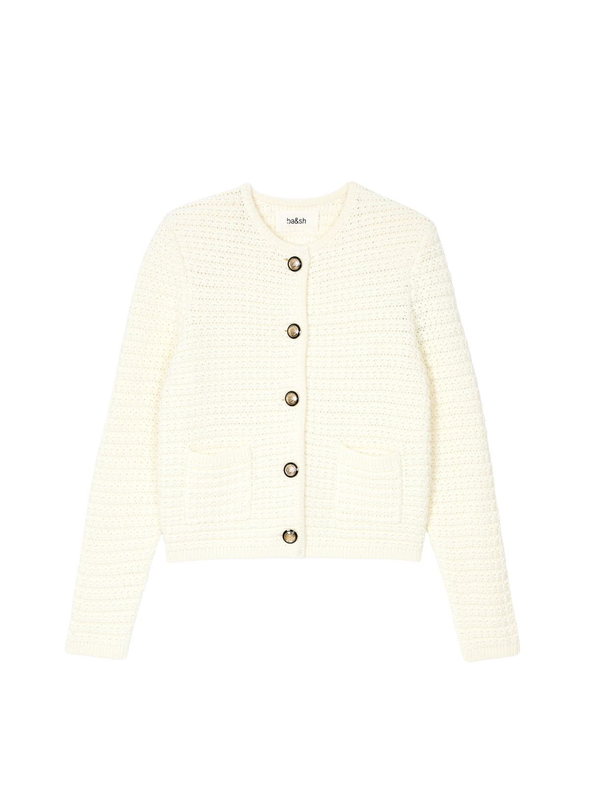 Raffineret GASPARD-cardigan fra BA&SH kan bæres som en jakke. Cardiganen har en rund krave og lange ærmer, der afslører håndleddene. Udover et cropped snit har den en iøjnefaldende tekstureret ottoman-søm for en tweed-effekt. Den lukkes med sorte guldfarvede knapper, og den fede detalje er, at den har lommer! Brug den med afslappede eller smarte outfits – den vil altid være perfekt!Længde: ca. 50 cm