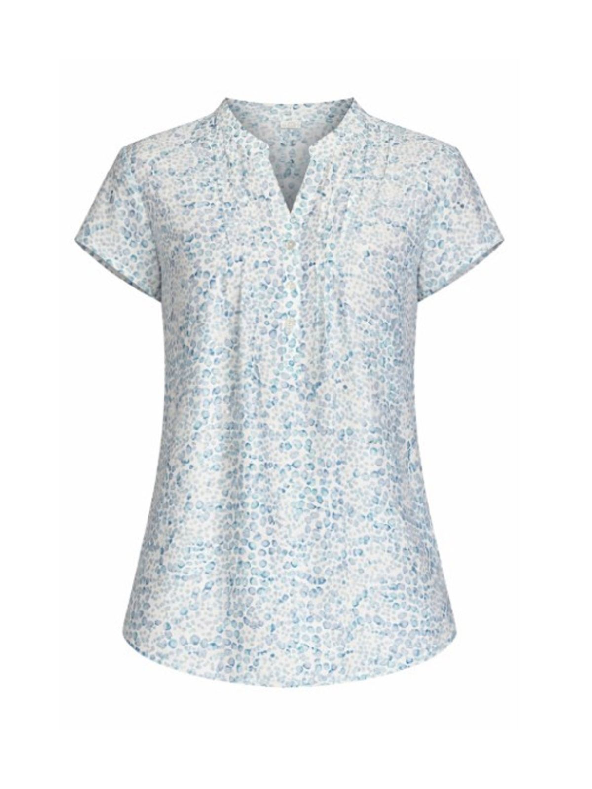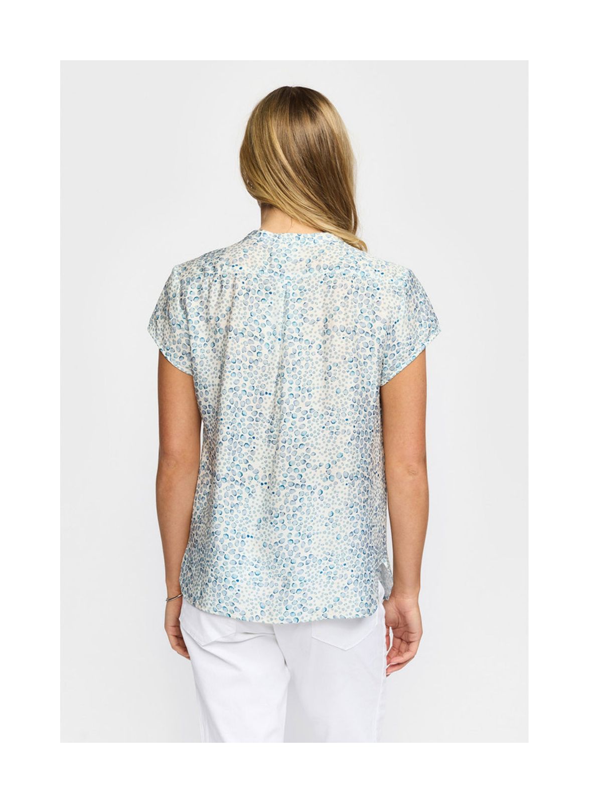 Elegant prikket bluse fra 2 BIZ i mønster i blå nuancer, der giver et friskt pust til din garderobe. Blusen har rund hals med V-udsnit samt korte cap ærmer og let rundet kant forneden.Længde: ca 60 cm