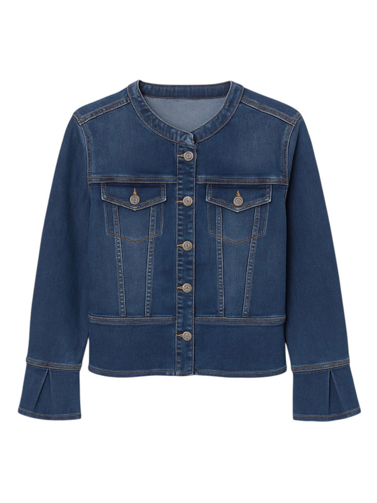 Smart denim jakke fra 2 BIZ i stilfuld kort design med rund hals, 3/4 ærmer med peplum manchet samt knaplukning og brystlomme effekt.Længde: 50 cm