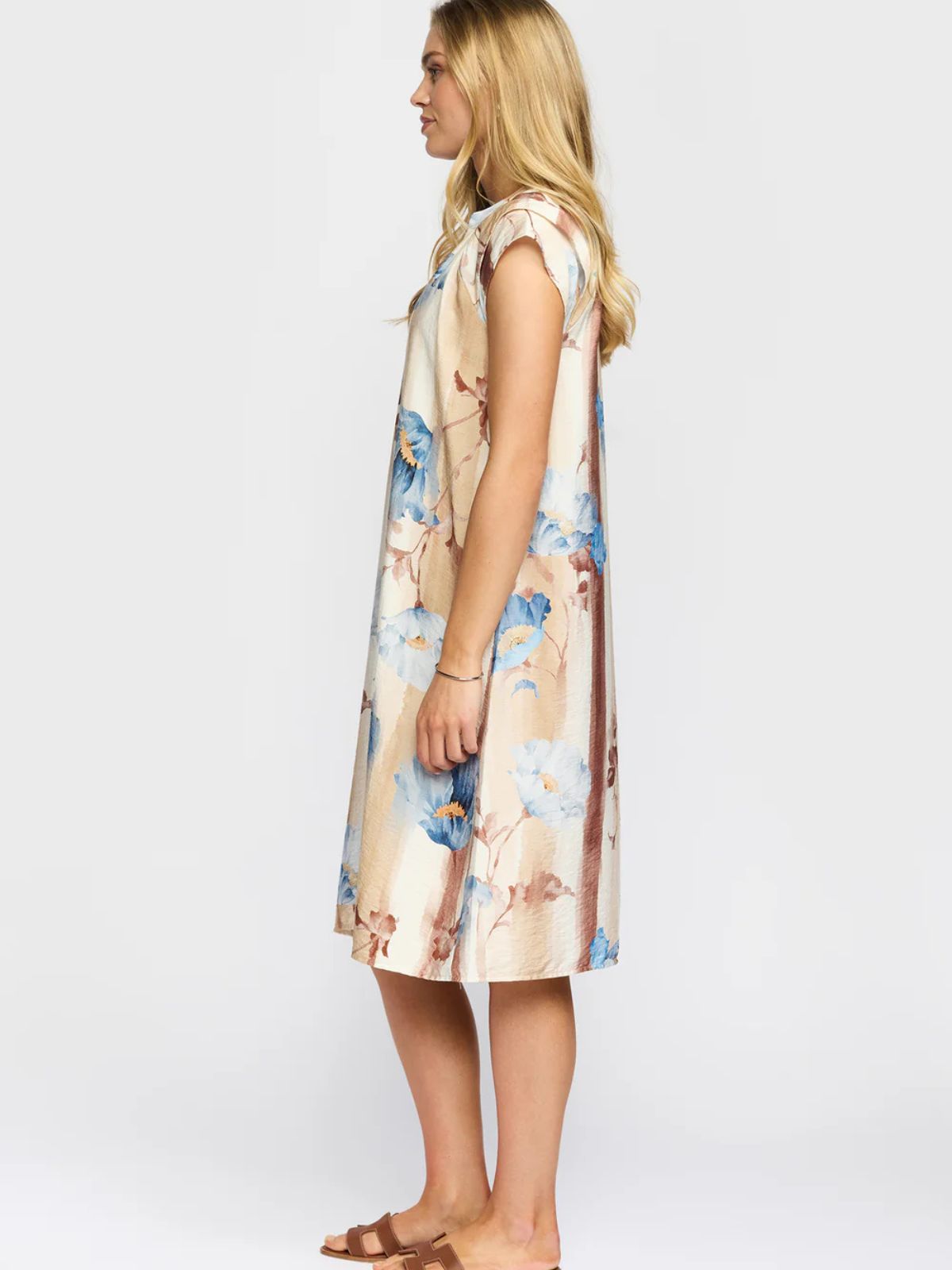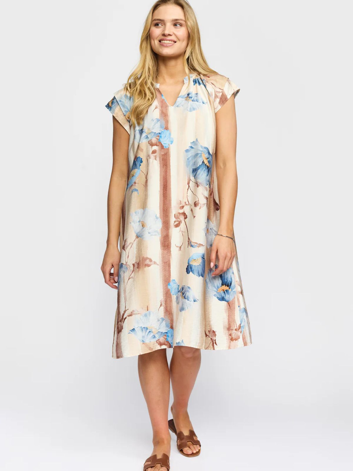 Elegant kjole fra 2 BIZ med smukt flora mønster samt i let A-line. Kjolen har en rund hals med V-udsnit samt korte flatterende ærmer,Længde: 105 cm