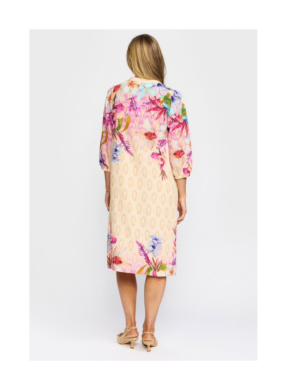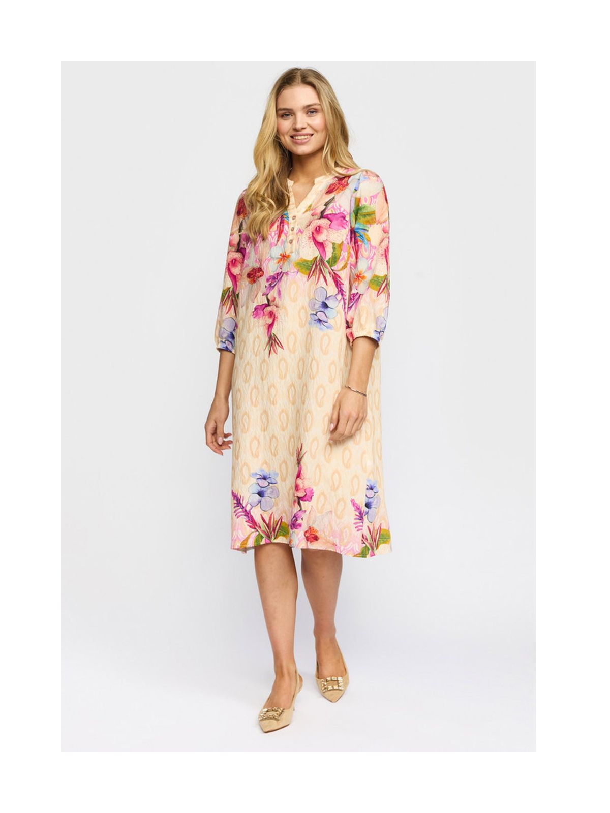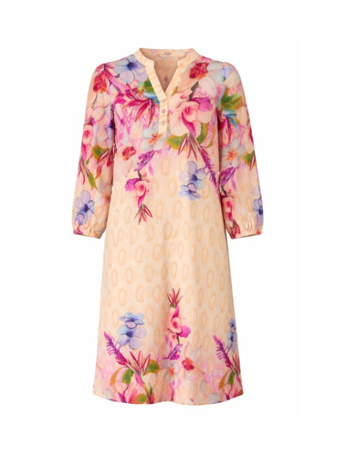 Romantisk sommer kjole fra 2 BIZ i smukke klare farver samt i eksotisk flower print. Kjolen har rund hals med V-udsnit og kort knapliste let A-line samt 3/4 lange ærmer me elastisk kant. En skøn kjole til sommerens fester, ferie eller hver dag.Længde: ca. 110 cm