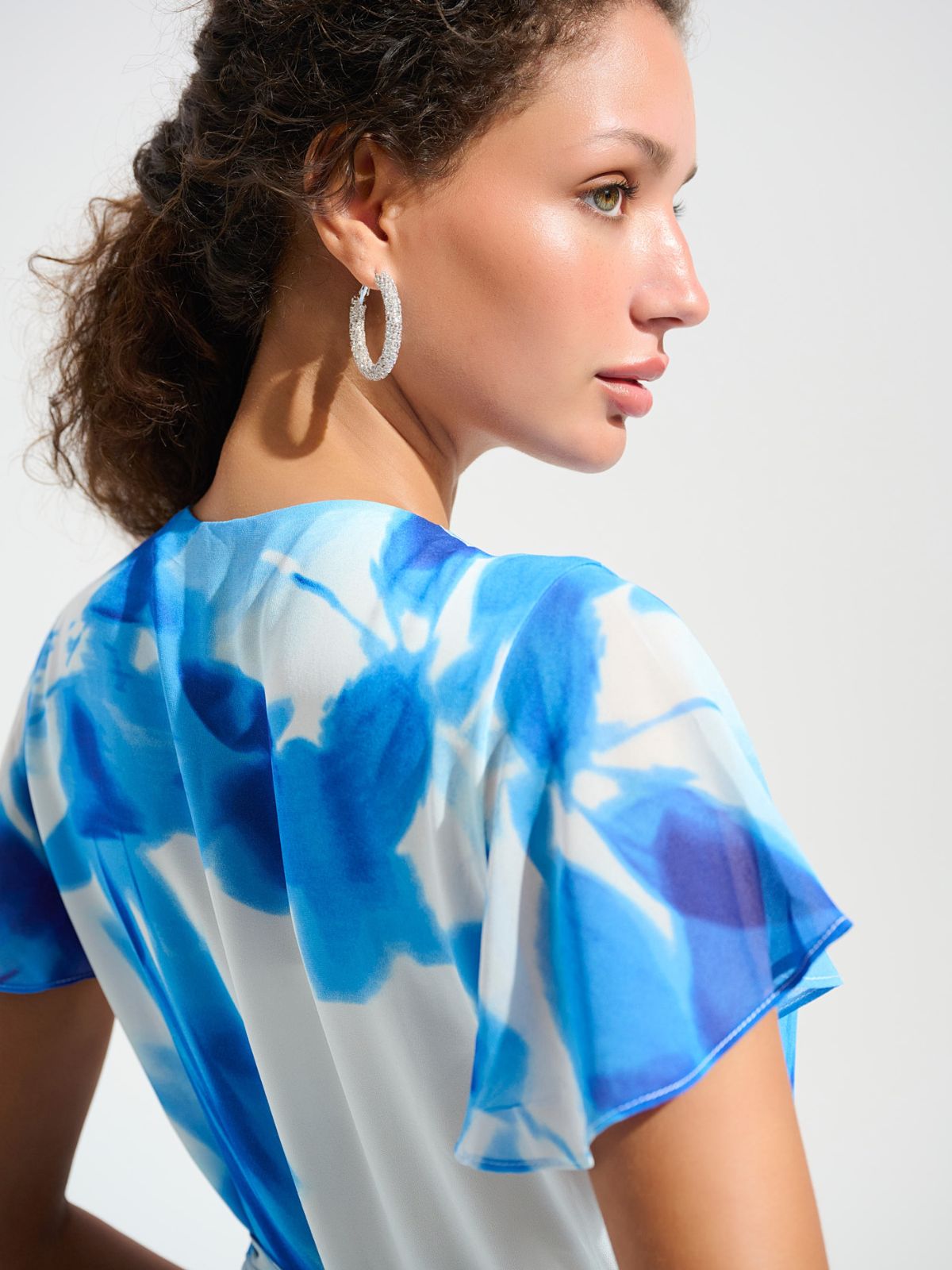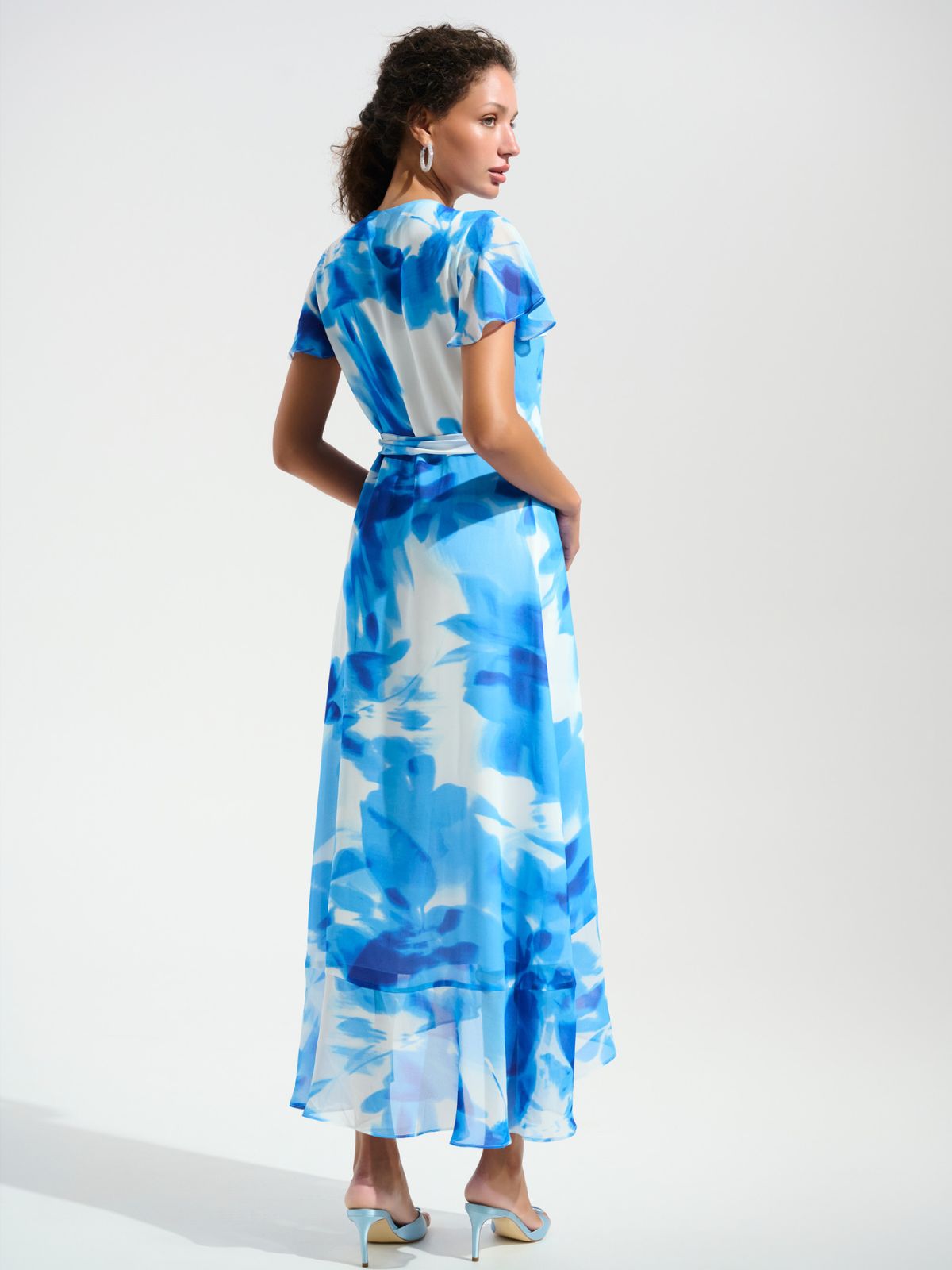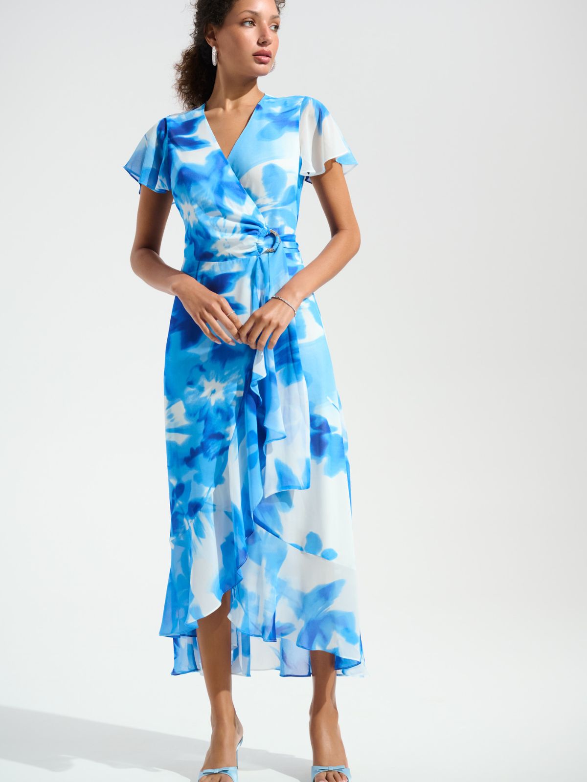 Raffineret midikjole fra Joseph Ribkoff i smuk farverigt asymmetrisk wrap-design. Kjoeln har en dyb V-udskæring samt bælte med similisten detaljer som fremhæver din silhuet. Det smukke mønster giver et strejf af femininitet, mens korte flatterende ærmer giver en luftig udtryk. Ideel til dem, der søger både stil og komfort til mange forskellige anledninger.Længde: ca. 130 cm