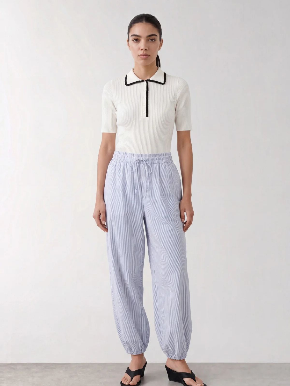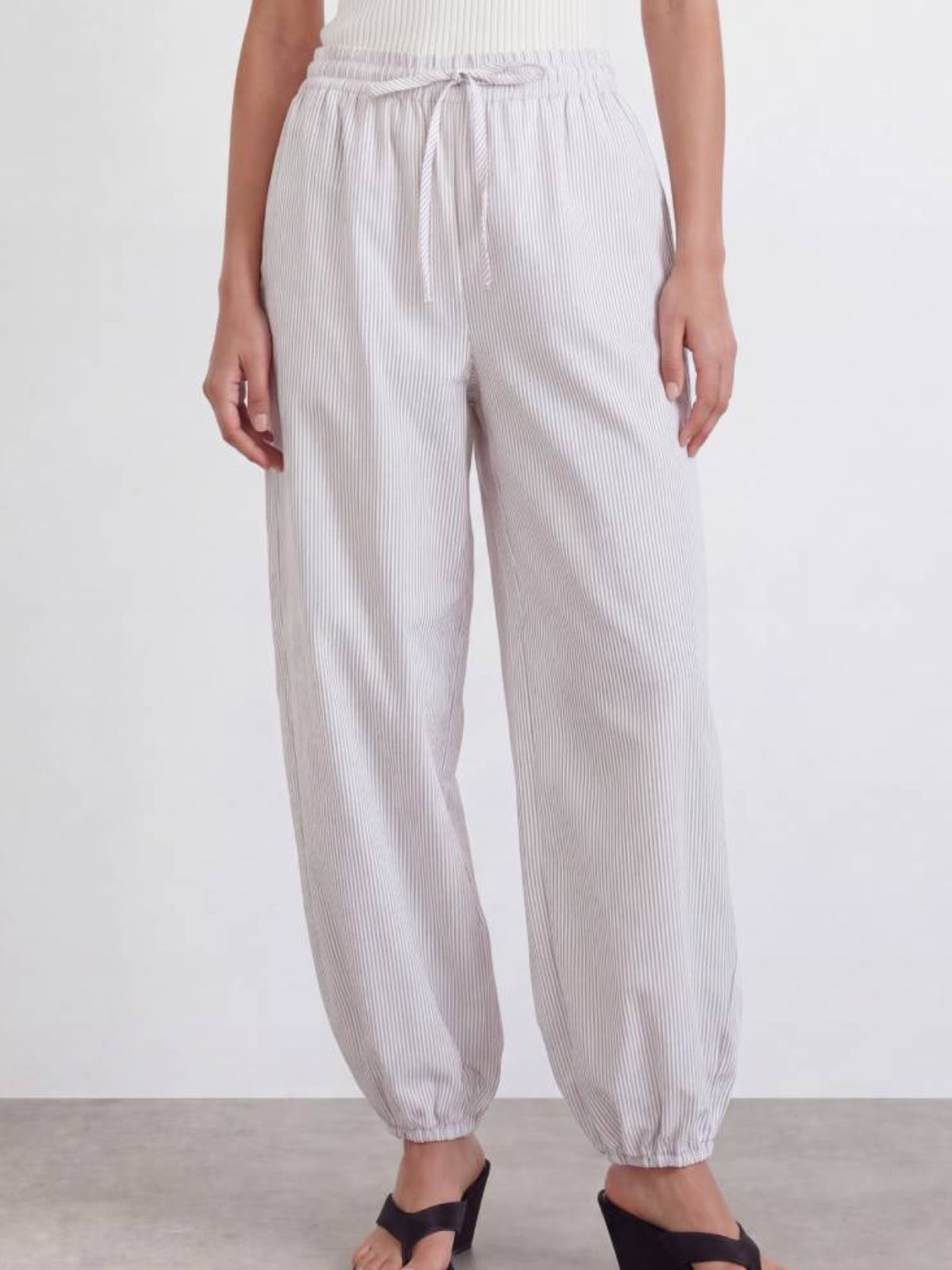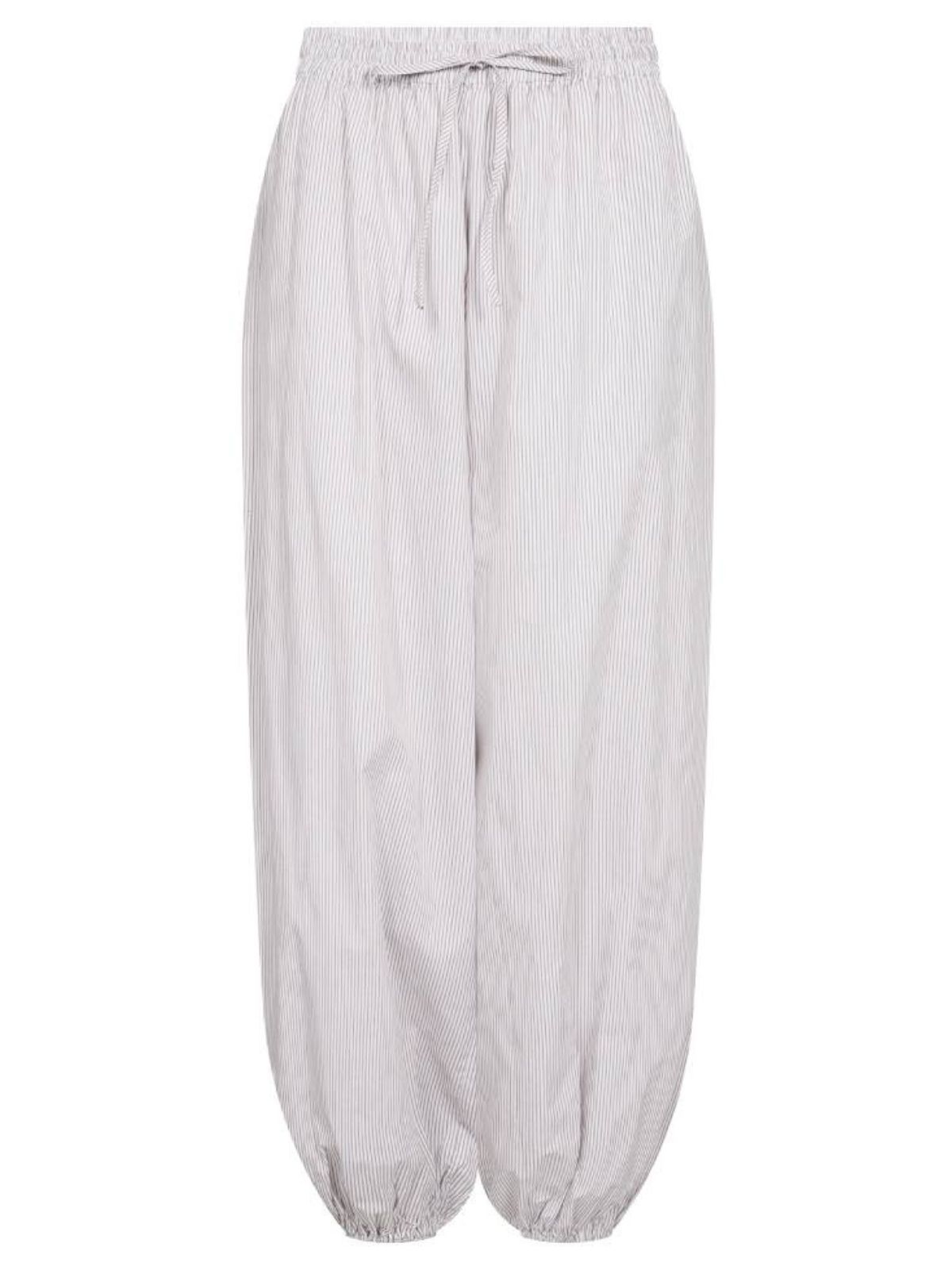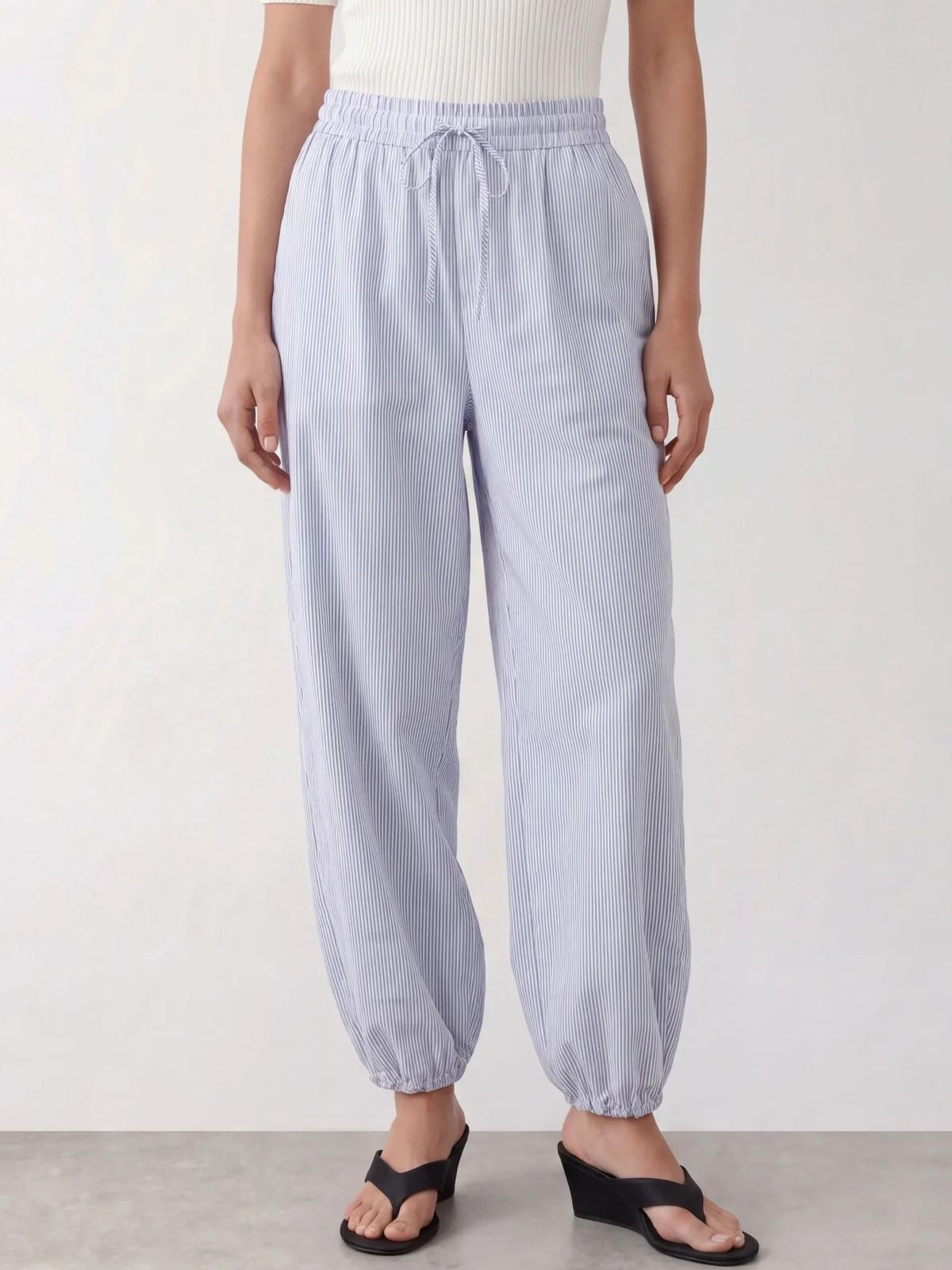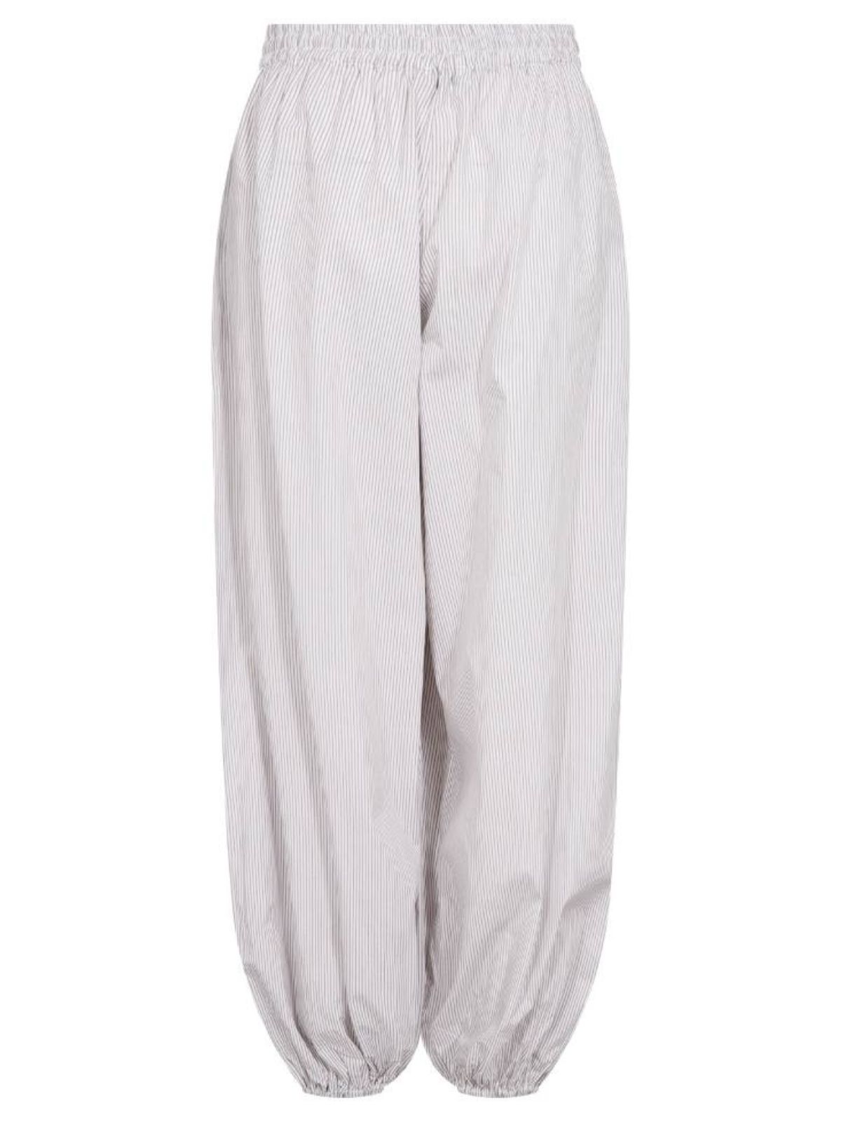RISS 1 Casual buks fra Leveté Room fremstillet af 100 % økologisk bomuld. Bukserne har en elastisk linning med løbegang, fuld længde og et diskret nålestribet mønster. Sæt dem sammen med en tætsiddende top og slip-on-sneakers for et ubekymret look.Indvendig Benlængde: ca. 80 cm
