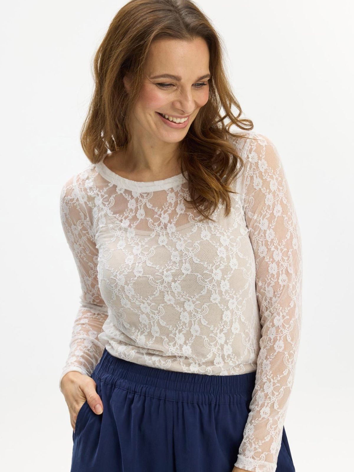 Feminin kropsnær mesh bluse fra InFront i en flot let transparent blondekvaliet. Brug blusen over en top eller under en bluse samt kjole.Længde: ca. 60 cm